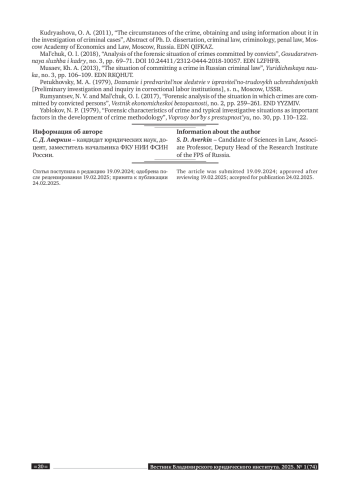 8. Мальчук 2018 - Мальчук О. И. Анализ криминалистической обстановки совершения преступлений осужденными // Государственная служба и кадры. 2018. № 3. С. 69-71. DOI: 10.24411/2312-0444-2018-10057 EDN: LZFHFB