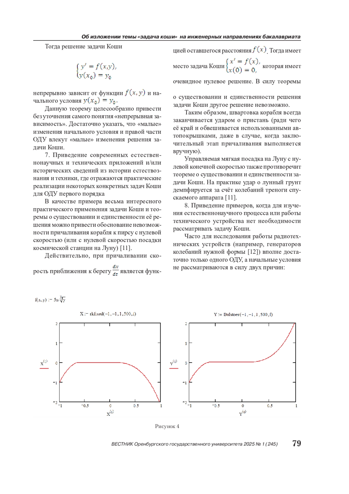 Реформирование высшей школы приводит к сокращению доли аудиторных занятий, что отрицательно влияет на изучение дисциплинарного математического цикла. Таким образом, возникает необходимость усиления роли самостоятельной работы студентов. Повышение эффективности самостоятельной работы возможно при использовании межпредметных связей с профильными дисциплинами. Для изучения темы «Задача Коши для ОДУ первого порядка» студентами инженерных наук при очно-заочном обучении мы приходим к новому прикладному подходу, в результате чего получается, как вводится идея задачи Коши, раскрывается смысл ее начального условия и обосновываются основные требования к рассматриваемой задаче и к ее решению. Предлагаемый подход должен включать ряд этапов. Для повышения эффективности самостоятельной работы используйте методическое обеспечение. В зависимости от направления можно применять методические указания, интерактивные методические указания, интегрированные с видеофайлами, приложениями, написанными на различных языках высокого уровня и т. п. д. Таким образом, изучение студентами инженерных дисциплин на тему «Задача Коши для ОДУ первого порядка» должно проводиться в неразрывном единстве с профилирующими дисциплинами и со стандартной техникой и математикой при широком применении информационных технологий.