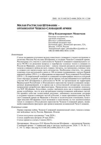 Изучение истории возникновения чешско-словацких добровольческих формирований на территориях России, Франции и Италии в период Первой мировой войны за последние 30 лет стало одним из значимых направлений в чешской, словацкой и российской исторической науке. Активизация исследования данной тематики произошла на фоне двух значимых годовщин: столетия начала Первой мировой войны (2014 г.) и столетнего юбилея со дня основания Чехословацкой Республики (2018 г.). В числе прочих в современной историографии разрабатываются и сюжеты, связанные с работой по организации национальных войсковых единиц, которая велась лидерами чешско-словацкой заграничной акции ― председателем образованного в феврале 1916 г. Чешско-Словацкого национального совета (ЧСНС) Томашем Гарригом Масариком, его заместителем Йозефом Дюрихом, генеральным секретарем данной организации Эдвардом Бенешем и представителем словацкого народа при ЧСНС, словацким ученым и политиком Миланом Растиславом Штефаником. Современная научная литература, посвященная основным вехам жизни и деятельности последнего, представлена в первую очередь сборниками статей, опубликованными в 1991, 1999, 2000, 2010 и 2014 гг.1, равно как и отдельными монографиями2.