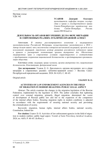 В статье рассматриваются изменения в миграционном законодательстве Российской Федерации, осуществленные законодателем в 2024 г. Автор делает вывод, что ужесточение контроля над внешней миграцией, прежде всего нелегальной миграцией, определило вектор развития российского публичного права и привело к расширению компетенции органов внутренних дел. Обеспечение миграционных прав в современных условиях корректируется в соответствии с требованиями сохранения национальной безопасности и предотвращения криминализации общества.