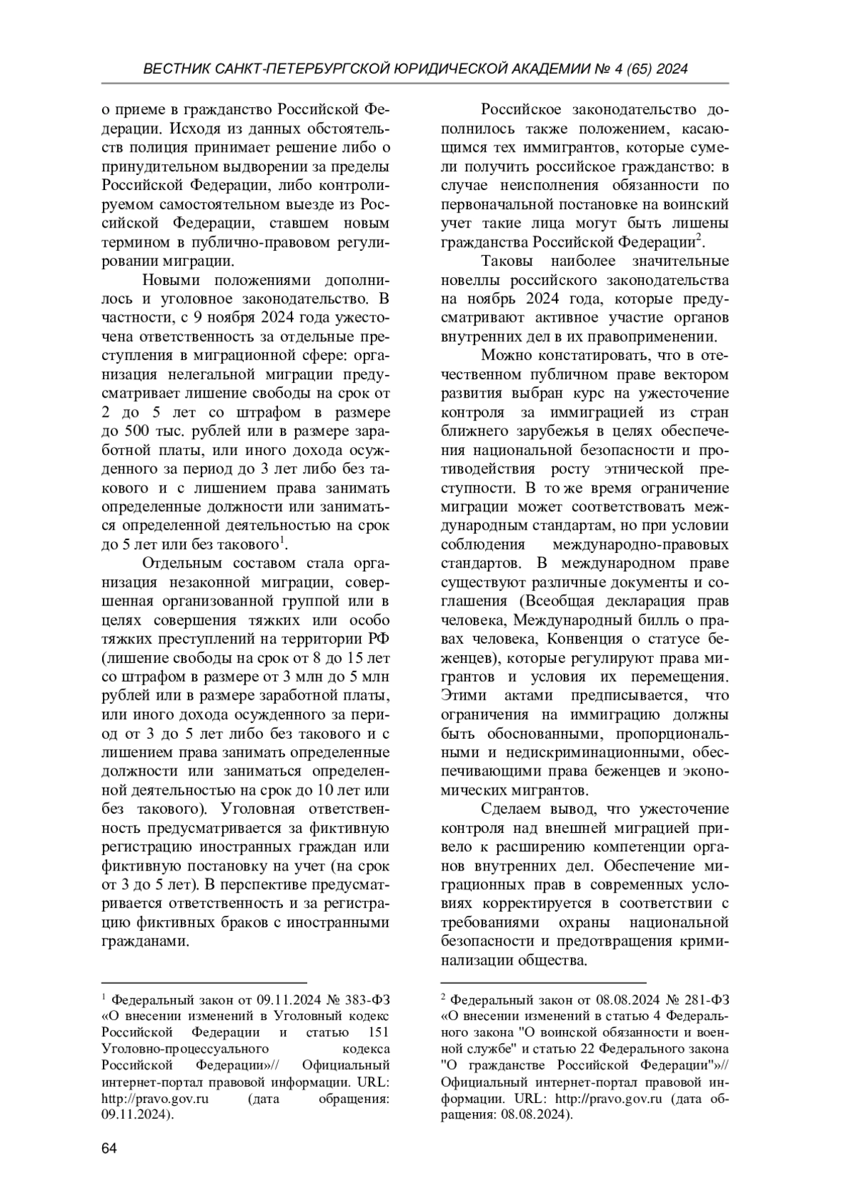 10. Зенькович О. “Считают себя хозяевами”: как изменят жизнь мигрантов 4 новых закона // RTVI 29.10.2024. URL: https://rtvi.com/news/schitayut-sebya-hozyaevami-kak-izmenyat-zhizn-migrantov-4-novyh-zakona/(дата обращения: 15.11.2024).