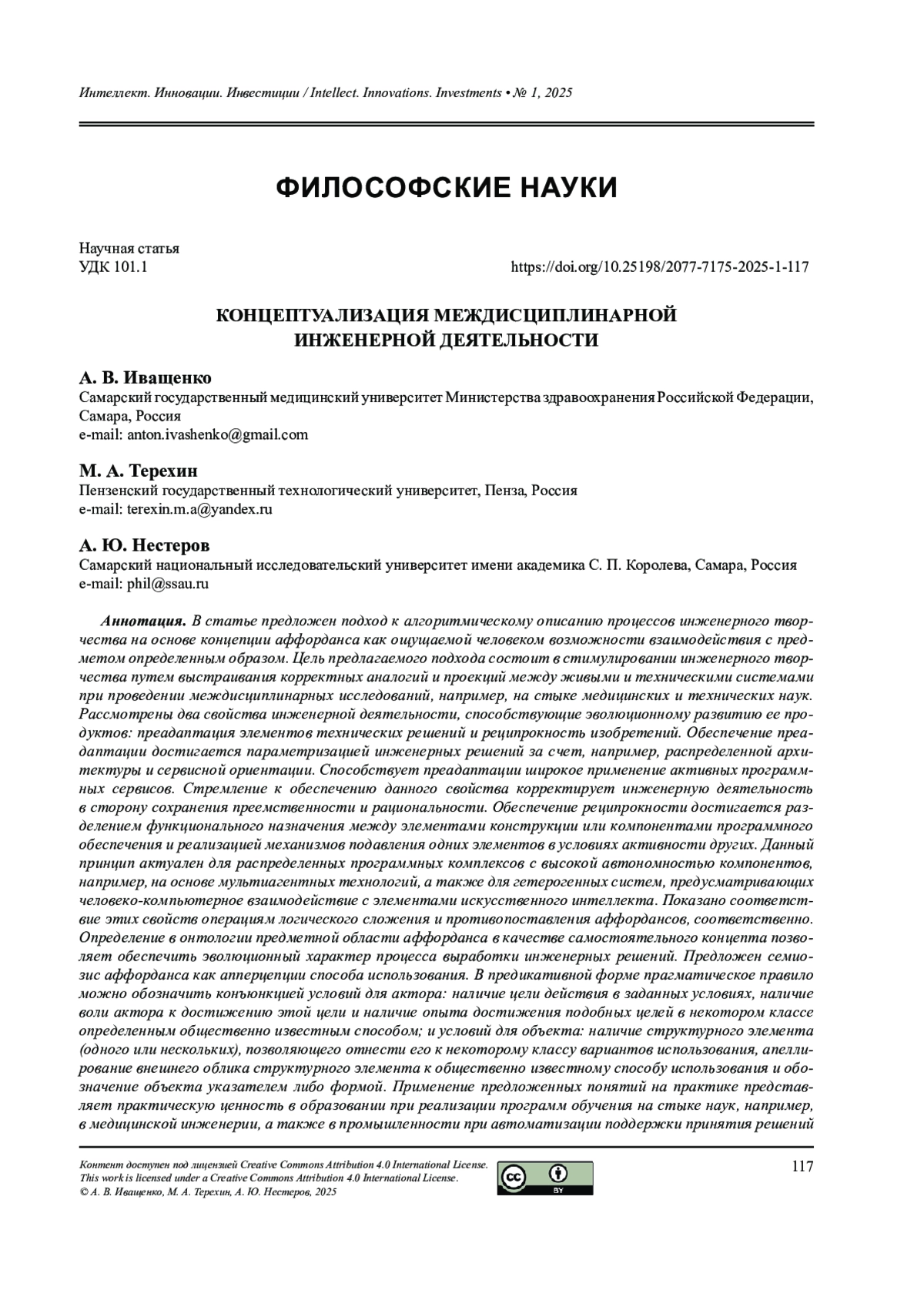 В статье предложен подход к алгоритмическому описанию процессов инженерного творчества на основе концепции аффорданса как ощущаемой человеком возможности взаимодействия с предметом определенным образом. Цель предлагаемого подхода состоит в стимулировании инженерного творчества путем выстраивания корректных аналогий и проекций между живыми и техническими системами при проведении междисциплинарных исследований, например, на стыке медицинских и технических наук. Рассмотрены два свойства инженерной деятельности, способствующие эволюционному развитию ее продуктов: преадаптация элементов технических решений и реципрокность изобретений. Обеспечение преадаптации достигается параметризацией инженерных решений за счет, например, распределенной архитектуры и сервисной ориентации. Способствует преадаптации широкое применение активных программных сервисов. Стремление к обеспечению данного свойства корректирует инженерную деятельность в сторону сохранения преемственности и рациональности. Обеспечение реципрокности достигается разделением функционального назначения между элементами конструкции или компонентами программного обеспечения и реализацией механизмов подавления одних элементов в условиях активности других. Данный принцип актуален для распределенных программных комплексов с высокой автономностью компонентов, например, на основе мультиагентных технологий, а также для гетерогенных систем, предусматривающих человеко-компьютерное взаимодействие с элементами искусственного интеллекта. Показано соответствие этих свойств операциям логического сложения и противопоставления аффордансов, соответственно. Определение в онтологии предметной области аффорданса в качестве самостоятельного концепта позволяет обеспечить эволюционный характер процесса выработки инженерных решений. Предложен семиозис аффорданса как апперцепции способа использования. В предикативной форме прагматическое правило можно обозначить конъюнкцией условий для актора: наличие цели действия в заданных условиях, наличие воли актора к достижению этой цели и наличие опыта достижения подобных целей в некотором классе определенным общественно известным способом; и условий для объекта: наличие структурного элемента (одного или нескольких), позволяющего отнести его к некоторому классу вариантов использования, апеллирование внешнего облика структурного элемента к общественно известному способу использования и обозначение объекта указателем либо формой. Применение предложенных понятий на практике представляет практическую ценность в образовании при реализации программ обучения на стыке наук, например, в медицинской инженерии, а также в промышленности при автоматизации поддержки принятия решений для информационной поддержки инженерной деятельности.