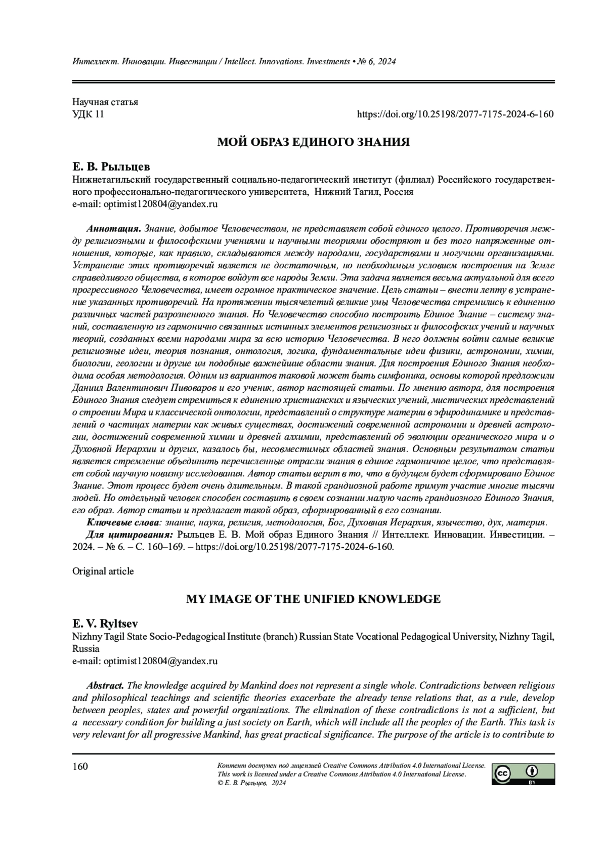 Знание, добытое Человечеством, не представляет собой единого целого. Противоречия между религиозными и философскими учениями и научными теориями обостряют и без того напряженные отношения, которые, как правило, складываются между народами, государствами и могучими организациями. Устранение этих противоречий является не достаточным, но необходимым условием построения на Земле справедливого общества, в которое войдут все народы Земли. Эта задача является весьма актуальной для всего прогрессивного Человечества, имеет огромное практическое значение. Цель статьи – внести лепту в устранение указанных противоречий. На протяжении тысячелетий великие умы Человечества стремились к единению различных частей разрозненного знания. Но Человечество способно построить Единое Знание ‒ систему знаний, составленную из гармонично связанных истинных элементов религиозных и философских учений и научных теорий, созданных всеми народами мира за всю историю Человечества. В него должны войти самые великие религиозные идеи, теория познания, онтология, логика, фундаментальные идеи физики, астрономии, химии, биологии, геологии и другие им подобные важнейшие области знания. Для построения Единого Знания необходима особая методология. Одним из вариантов таковой может быть симфоника, основы которой предложили Даниил Валентинович Пивоваров и его ученик, автор настоящей статьи. По мнению автора, для построения Единого Знания следует стремиться к единению христианских и языческих учений, мистических представлений о строении Мира и классической онтологии, представлений о структуре материи в эфиродинамике и представлений о частицах материи как живых существах, достижений современной астрономии и древней астрологии, достижений современной химии и древней алхимии, представлений об эволюции органического мира и о Духовной Иерархии и других, казалось бы, несовместимых областей знания. Основным результатом статьи является стремление объединить перечисленные отрасли знания в единое гармоничное целое, что представляет собой научную новизну исследования. Автор статьи верит в то, что в будущем будет сформировано Единое Знание. Этот процесс будет очень длительным. В такой грандиозной работе примут участие многие тысячи людей. Но отдельный человек способен составить в своем сознании малую часть грандиозного Единого Знания, его образ. Автор статьи и предлагает такой образ, сформированный в его сознании.