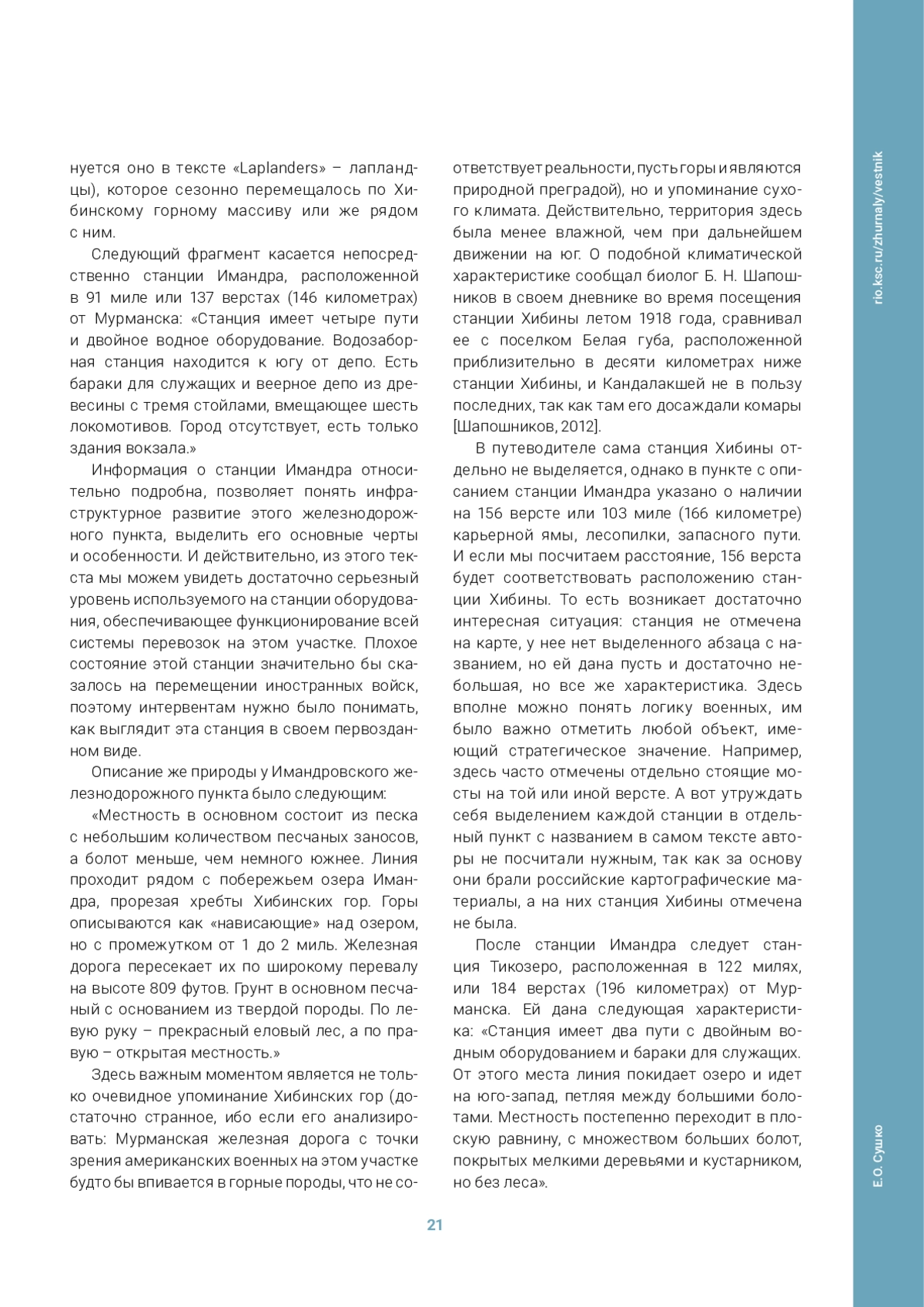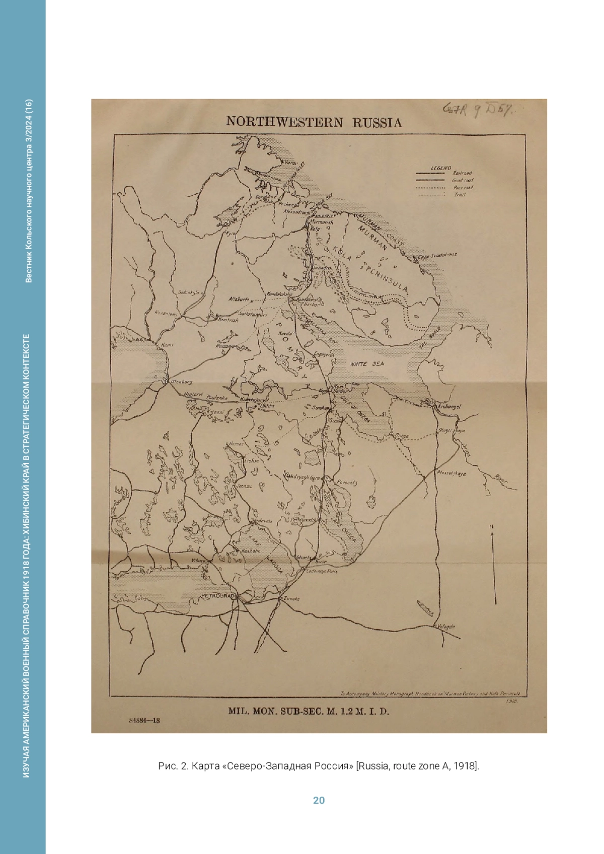 В статье рассматривается военный справочник США 1918 года «Россия, маршрутная зона А: Мурманская железная дорога и Кольский полуостров: Информация и заметки о маршруте Мурманск-Петроград». Этот источник позволяет понять, как иностранные военные планировали использовать Русский Север в своих целях. Главное же внимание в исследовании уделяется анализу всей представленной в путеводителе информации о Хибинском крае, включая железнодорожные станции, природу, инфраструктуру и расстояния.
