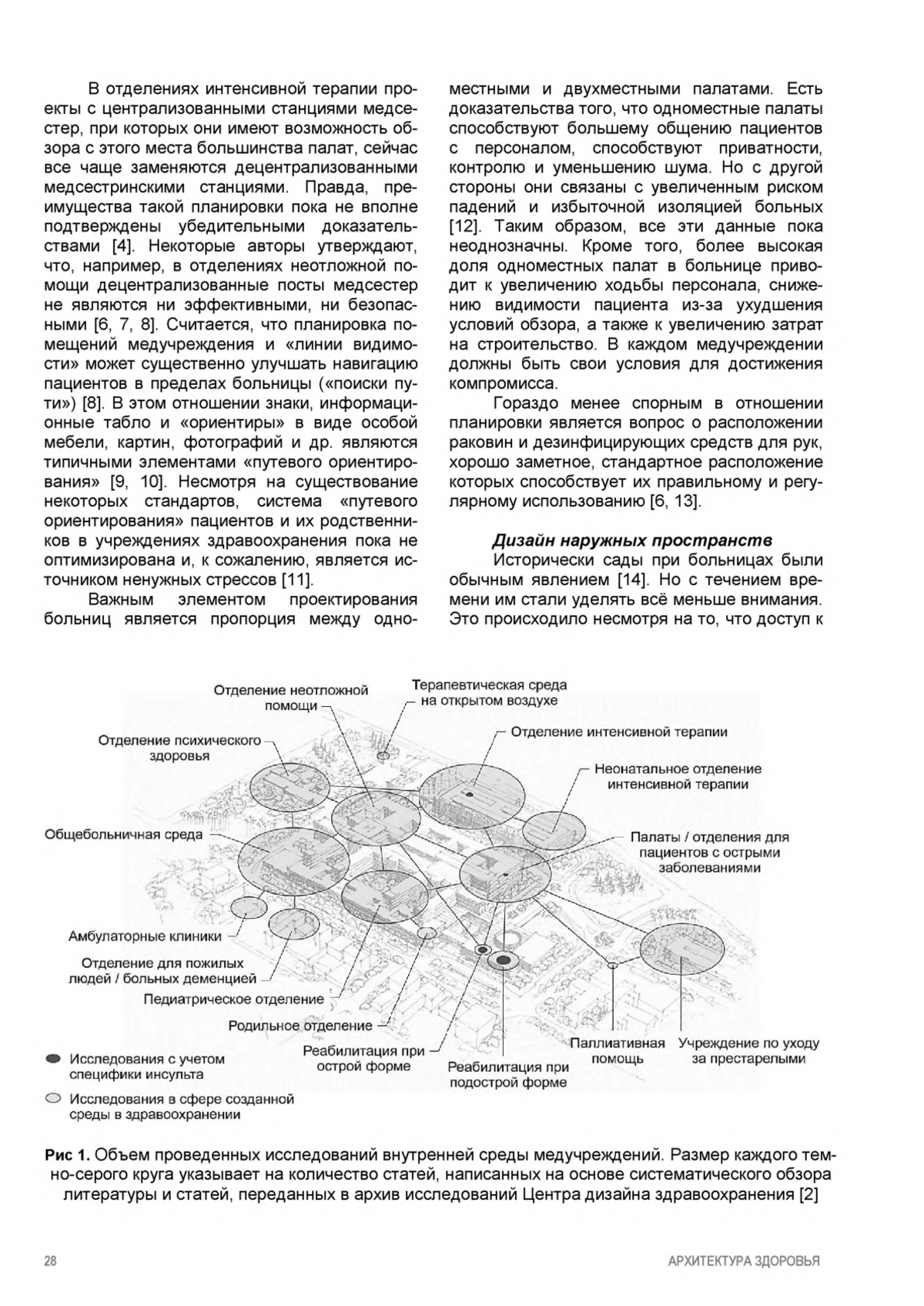 Современные подходы к вопросам проектирования жилья в конечном итоге могут быть применены и к проектированию медицинских учреждений (больниц, поликлиник, диспансеров и др.). Однако требования к разработке, оборудованию и использованию медицинских учреждений являются гораздо более строгими. Последние годы ведутся активные исследования по теме: благоприятная медицинская среда, с тем, чтобы изучить взаимосвязь между стрессом и исцелением, а также усиление влияния медицинской среды на пациентов и персонал. «Концепция благоприятной среды относится к характеристикам окружающей среды, которые снижают стресс и вызывают положительные реакции…» [1]. Кроме того, медучреждения имеют свою специфику в плане оборудования, что делает их одними из самых дорогостоящих зданий. Такая особенность может касаться учреждений, занятых диагностикой и лечением инсультов, инфарктов, онкологических заболеваний, травм и др.
