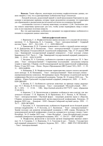 1. Веремеева, С. А. Морфологическая оценка желудка и его сосудистой системы у кроликов / С. А. Веремеева, К. А. Сидорова. - Текст: непосредственный // Аграрный вестник Урала. - 2017. - № 6 (160). - С. 1. EDN: ZHDAXV