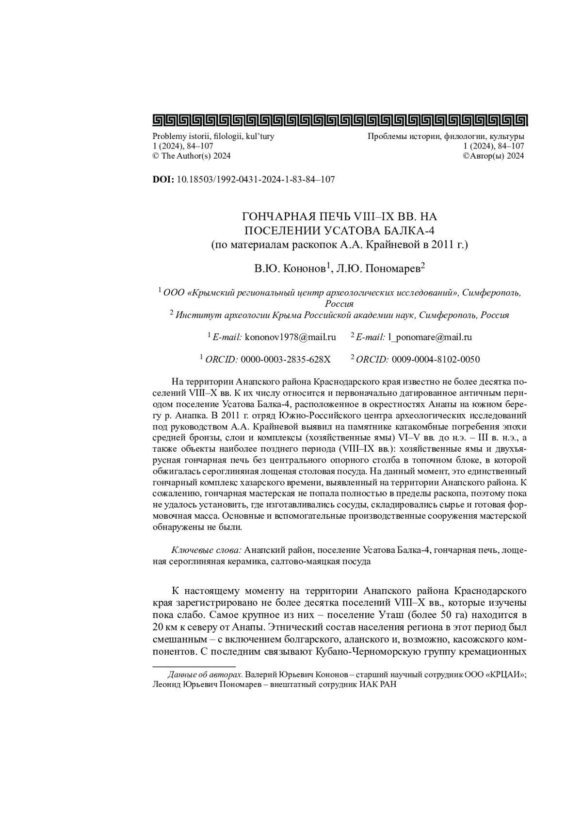 16. Кононов, В.Ю., Пономарев, Л.Ю. 2024б: Гончарный комплекс VIII-IX вв. поселения Марьянское-1 в Нижнем Прикубанье (по результатам работ 2013 г.). (в печати).