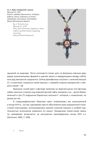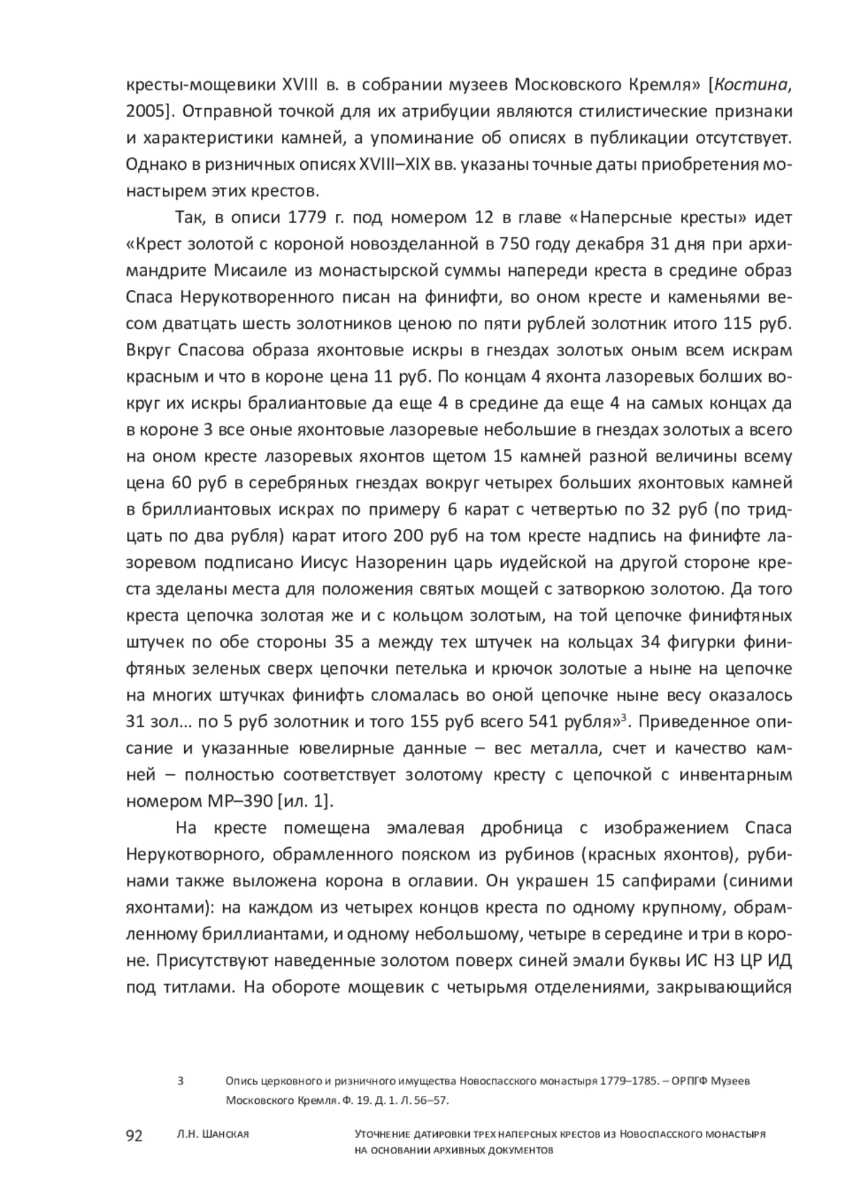 в 1919 г. из новоспасского монастыря в оружейную палату Московского Кремля поступили церковные ценности: напрестольные и наперсные кресты, литургические сосуды, облачения. помимо имущества, хранившегося в соборах монастыря и монастырской ризнице, в музее оказались документы – «описная книга новоспасского монастыря церковным и ризным вещам учиненная с 779 г.» и ее копия1, записи в которых можно соотнести с поступившими в том же году предметами. в Российском государственном архиве древних актов также сохранился довольно большой комплекс документов2, относящихся к новоспасскому монастырю, в том числе записные книги и ведомости церковной утвари, описи монастырского имущества. среди зафиксированных в описях вещей, среди сделанных по различным поводам и в силу различных обстоятельств записей в деловых бумагах достаточно легко опознаются памятники, хранящиеся ныне в собрании Музеев Московского Кремля. в данном исследовании стоит задача скорректировать датировку трех наперсных крестов, опираясь на информацию, содержащуюся в вышеназванных архивных источниках.