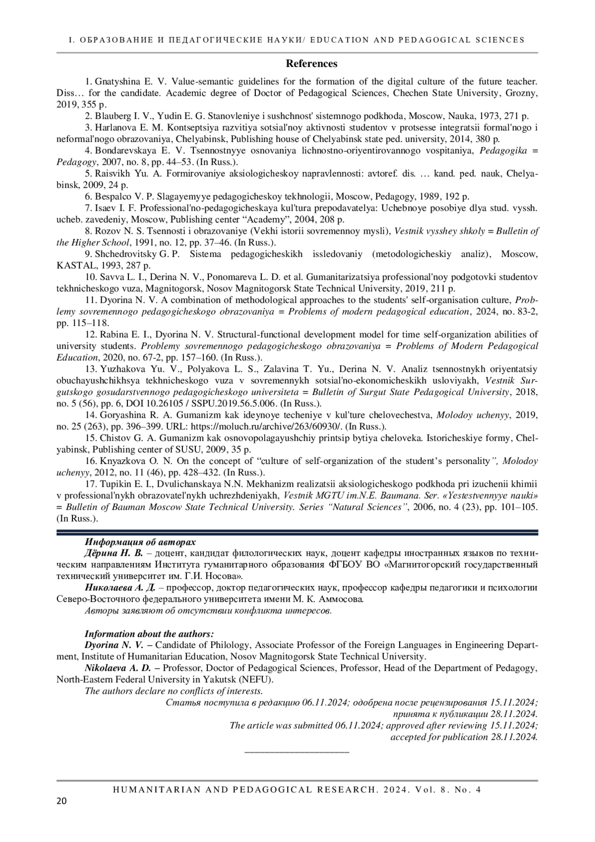 10. Savva L. I., Derina N. V., Ponomareva L. D. et al. Gumanitarizatsiya professional’noy podgotovki studentov tekhnicheskogo vuza, Magnitogorsk, Nosov Magnitogorsk State Technical University, 2019, 211 p.