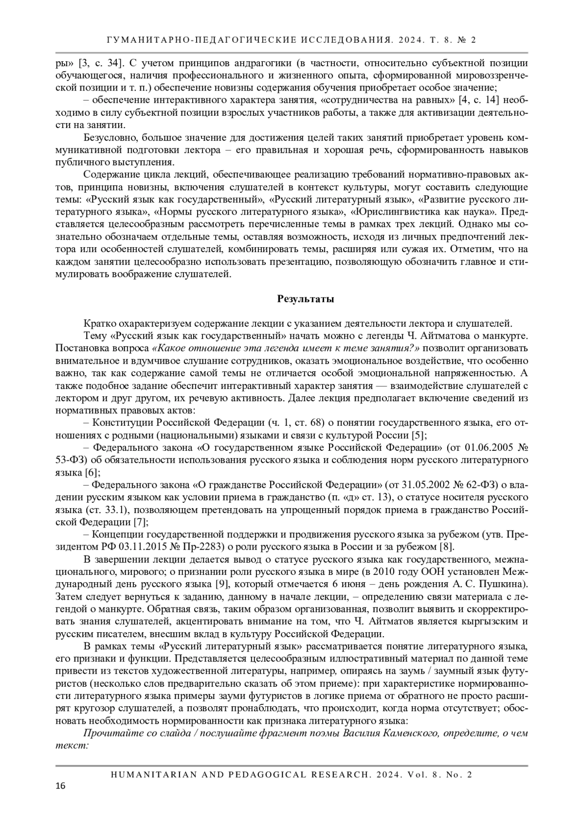 ШАРКО М. И. ЦИКЛ ЛЕКЦИЙ О РУССКОМ ЯЗЫКЕ ДЛЯ ЮРИСТОВ НА ЗАНЯТИЯХ ПО ПРОФЕССИОНАЛЬНОЙ СЛУЖЕБНОЙ ПОДГОТОВКЕ: МЕТОДИЧЕСКИЙ АСПЕКТ // ГУМАНИТАРНО-ПЕДАГОГИЧЕСКИЕ ИССЛЕДОВАНИЯ. 2024. Т. 8 № 2