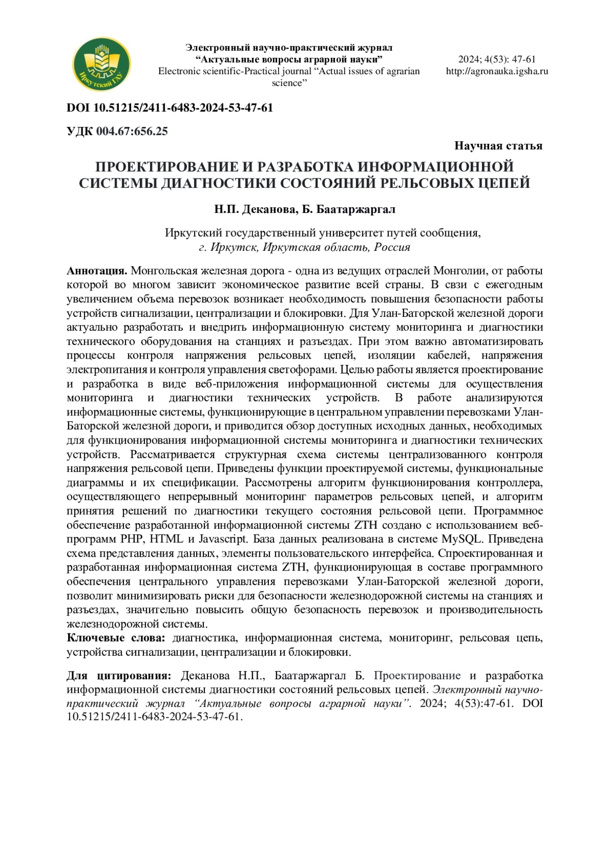 Монгольская железная дорога - одна из ведущих отраслей Монголии, от работы которой во многом зависит экономическое развитие всей страны. В свзи с ежегодным увеличением объема перевозок возникает необходимость повышения безопасности работы устройств сигнализации, централизации и блокировки. Для Улан-Баторской железной дороги актуально разработать и внедрить информационную систему мониторинга и диагностики технического оборудования на станциях и разъездах. При этом важно автоматизировать процессы контроля напряжения рельсовых цепей, изоляции кабелей, напряжения электропитания и контроля управления светофорами. Целью работы является проектирование и разработка в виде веб-приложения информационной системы для осуществления мониторинга и диагностики технических устройств. В работе анализируются информационные системы, функционирующие в центральном управлении перевозками Улан-Баторской железной дороги, и приводится обзор доступных исходных данных, необходимых для функционирования информационной системы мониторинга и диагностики технических устройств. Рассматривается структурная схема системы централизованного контроля напряжения рельсовой цепи. Приведены функции проектируемой системы, функциональные диаграммы и их спецификации. Рассмотрены алгоритм функционирования контроллера, осуществляющего непрерывный мониторинг параметров рельсовых цепей, и алгоритм принятия решений по диагностики текущего состояния рельсовой цепи. Программное обеспечение разработанной информационной системы ZTH создано с использованием веб-программ PHP, HTML и Javascript. База данных реализована в системе MySQL. Приведена схема представления данных, элементы пользовательского интерфейса. Спроектированная и разработанная информационная система ZTH, функционирующая в составе программного обеспечения центрального управления перевозками Улан-Баторской железной дороги, позволит минимизировать риски для безопасности железнодорожной системы на станциях и разъездах, значительно повысить общую безопасность перевозок и производительность железнодорожной системы.