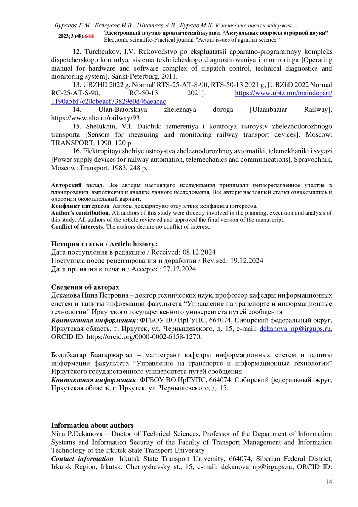 11. Пультяков, А.В. Анализ уровней диагностики устройств СЦБ системой АПК-ДК / А.В. Пультяков, Д.Е. Бурдакова // Иркутский государственный университет путей сообщения, Иркутск, Российская Федерация file:///C:/Users/SHLTS/Downloads/1068-Текст%20статьи-7265-1-10-20230520%20(8).pdf