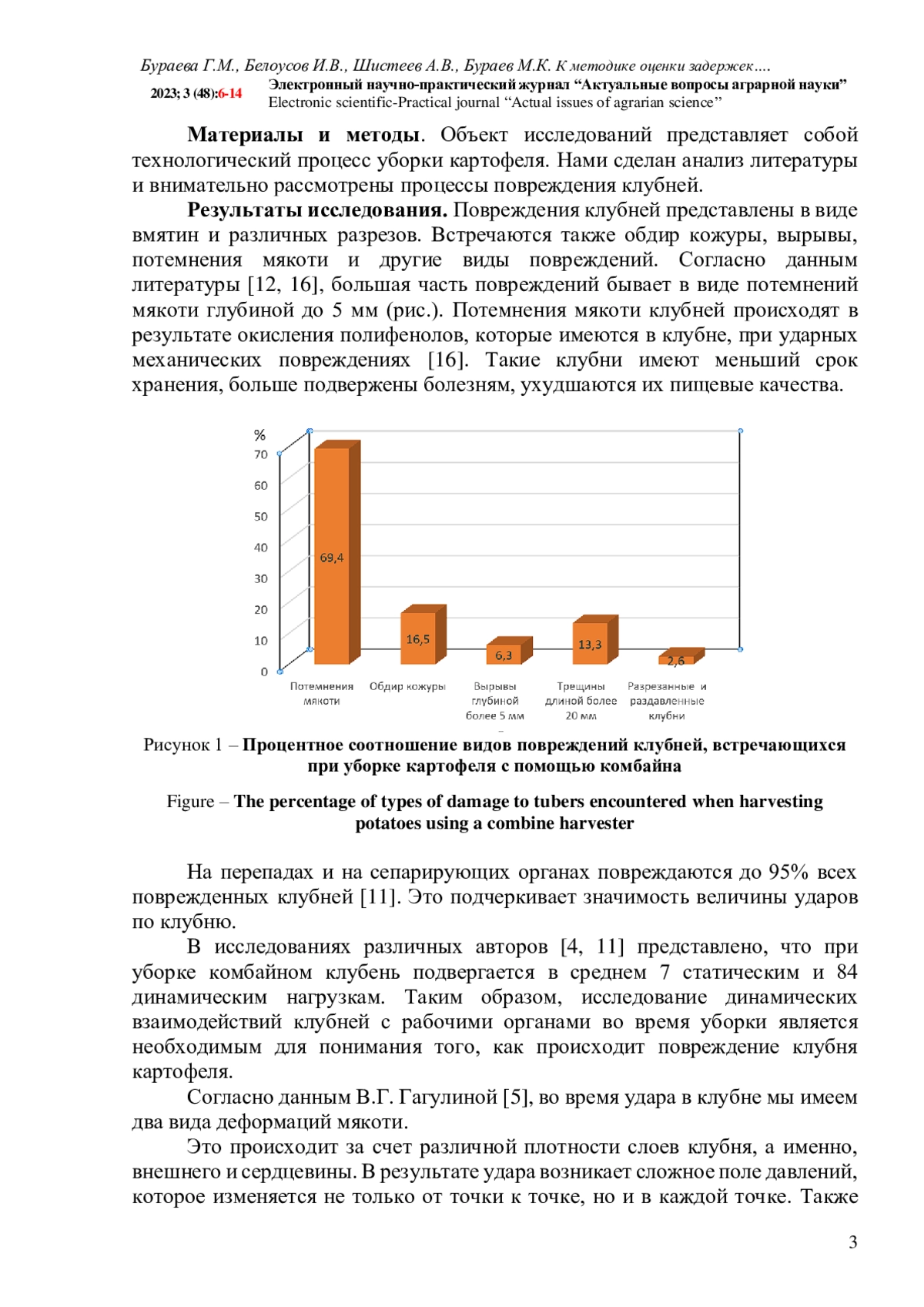 В настоящее время в РФ происходит определенный прогресс в сельскохозяйственной отрасли для внедрения овременных достижений науки в процессы производства, переработки и реализации продукции. Например, в Иркутской области проводятся исследования по разработке и применению моделей оптимизации производства растениеводческой продукции [7, 8, 10, 14, 15]. Кроме того, осуществдляются исследования в картофелеводстве региона [3]. Картофель – это распространенная сельскохозяйственная культура, как для России, так и для других стран [1, 5, 16]. В России картофелем занято более 1000000 га и производится более 30 млн тонн продукции [2]. Картофель собирают с помощью специальных машин в сложных условиях, которые не способствуют эффективности уборки картофеля. Данные различных исследований показывают [11, 12], что эффективность сепарации недостаточна и сопровождается повреждаемостью клубней. Повреждение клубней – комплексная проблема, которая должна быть подвергнута теоретическому анализу с целью выявления наиболее значимых факторов, что в дальнейшем приведет к снижению механических потерь на практике.