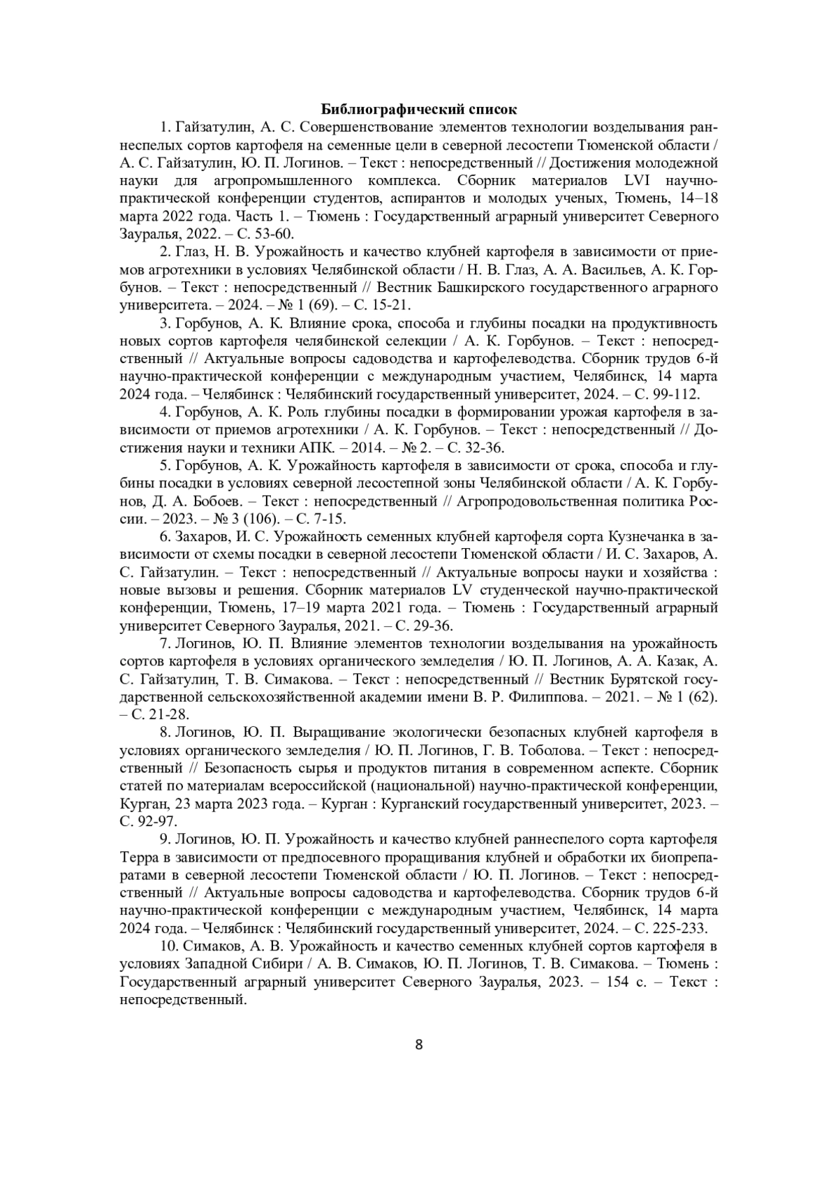 1. Гайзатулин, А. С. Совершенствование элементов технологии возделывания раннеспелых сортов картофеля на семенные цели в cеверной лесостепи Тюменской области / А. С. Гайзатулин, Ю. П. Логинов. - Текст: непосредственный // Достижения молодежной науки для агропромышленного комплекса. Сборник материалов LVI научно-практической конференции студентов, аспирантов и молодых ученых, Тюмень, 14-18 марта 2022 года. Часть 1. - Тюмень: Государственный аграрный университет Северного Зауралья, 2022. - С. 53-60. EDN: LXOHCB