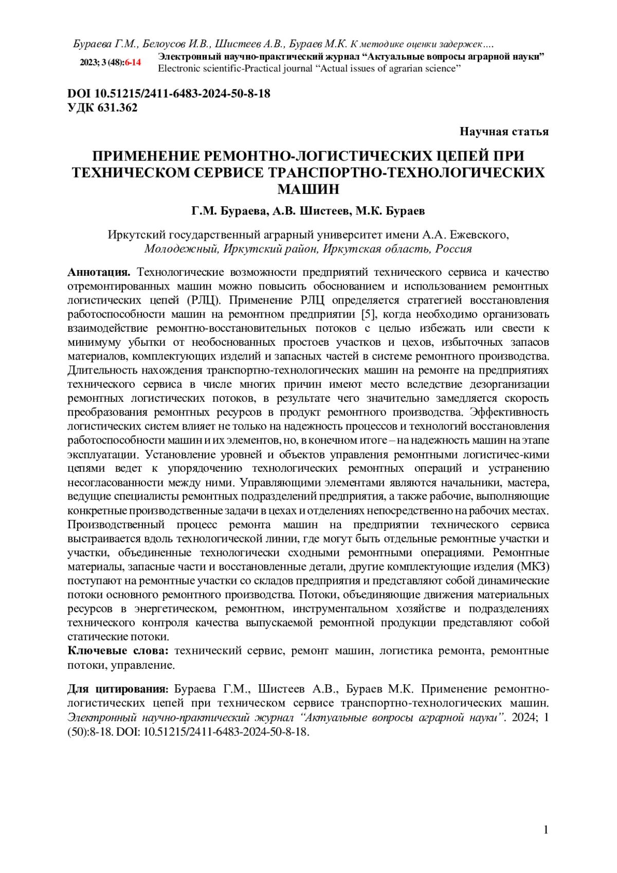 2. Бураева, Г.М. К совершенствованию системы технического сервиса машин в АПК / Г.М. Бураева, А.В. Шистеев // Климат, экология, сельское хозяйство Евразии: матер. X междунар. научно-практ. конф., Молодежный, 27-28 мая 2021 года. – Молодежный: Иркутский ГАУ, 2021. – С. 71-72. – EDN NOJBLJ. 3. Бураева, Г.М. Логистические принципы ремонтно-технического сервиса транспортно-технологических машин / Г.М. Бураева // Проблемы и перспективы устойчивого развития агропромышленного комплекса: матер. Всеросс. научно-практ. конф. с междунар. участием, посвящ. памяти А.А. Ежевского, п. Молодежный, 17-18 ноября 2022 года. – п. Молодежный: Иркутский ГАУ, 2022. – С. 51-57. – EDN ELYXKC. 4. Бураева, Г.М. Логистика ресурсодвижения в системе агротехнического сервиса / Г.М. Бураева // Инновационно-промышленный салон: матер. III Всеросс. научно-практ. конф. “Ремонт. Восстановление. Реновация”, 28 февраля – 2 марта 2012 г. – Уфа: Изд-во БашГАУ, 2012. – С. 126-131.