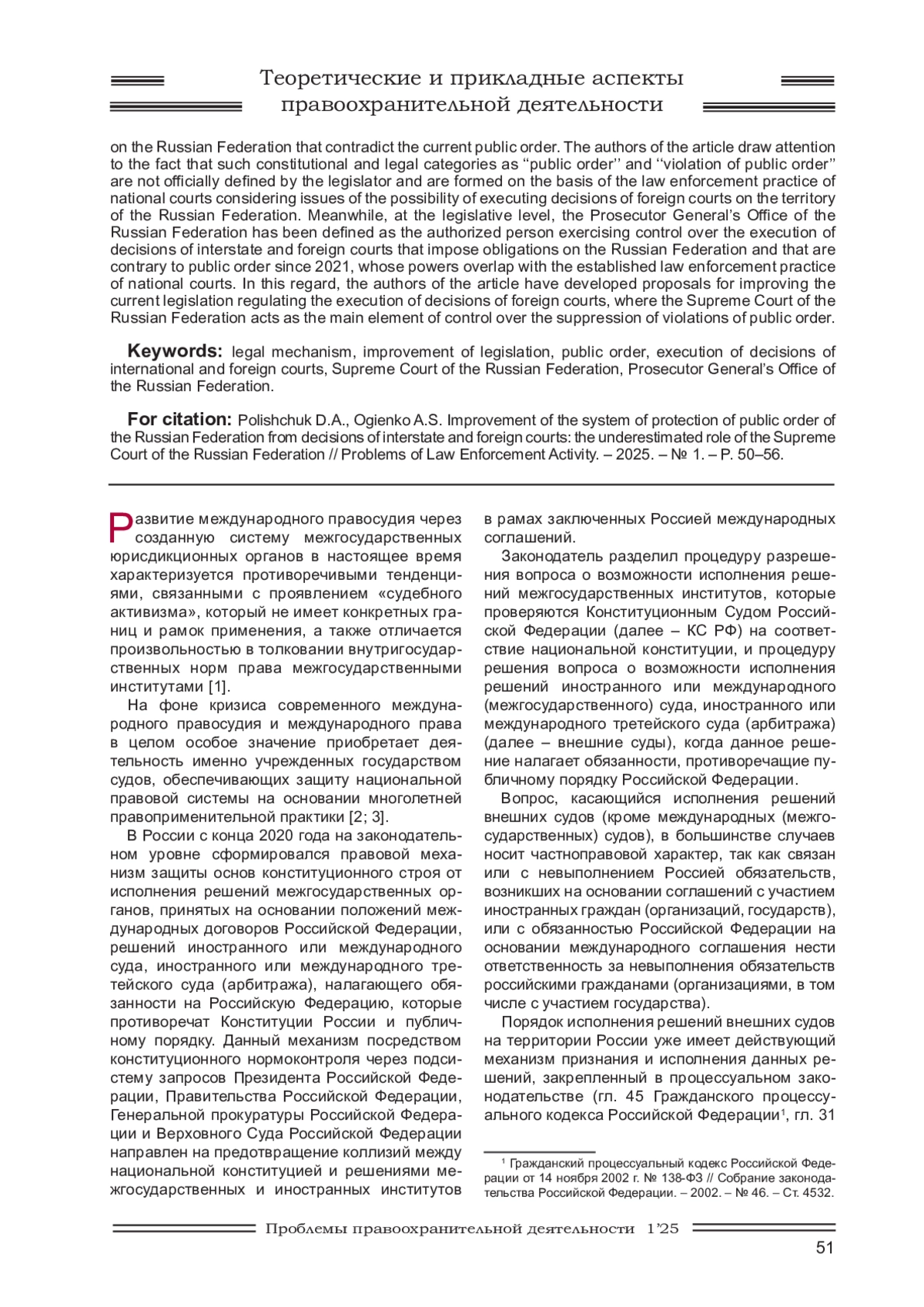 В статье рассматриваются вопросы, касающиеся совершенствования правового механизма защиты основ конституционного строя Российской Федерации от исполнения решений иностранного или международного суда, иностранного или международного третейского суда (арбитража), налагающих обязанности на Российскую Федерацию, которые противоречат действующему публичному порядку. Авторы статьи обращают внимание на то, что такие конституционно-правовые категории как «публичный порядок» и «нарушение публичного порядка» законодателем официально не определены и формируются на основании правоприменительной практики национальных судов, рассматривающих вопросы возможности исполнения на территории Российской Федерации решений внешних судов. Между тем на законодательном уровне в качестве уполномоченного лица, осуществляющего контроль за исполнением решений межгосударственных и иностранных судов, налагающих обязанности на Российскую Федерацию, которые противоречат публичному порядку, с 2021 года определена Генеральная прокуратура Российской Федерации, чьи полномочия пересекаются со сформировавшейся правоприменительной практикой национальных судов. В связи с чем авторами статьи разработаны предложения по совершенствованию действующего законодательства, регулирующего вопросы исполнения решений внешних судов, где в качестве основного элемента контроля за пресечением нарушения публичного порядка выступает Верховный Суд Российской Федерации.
