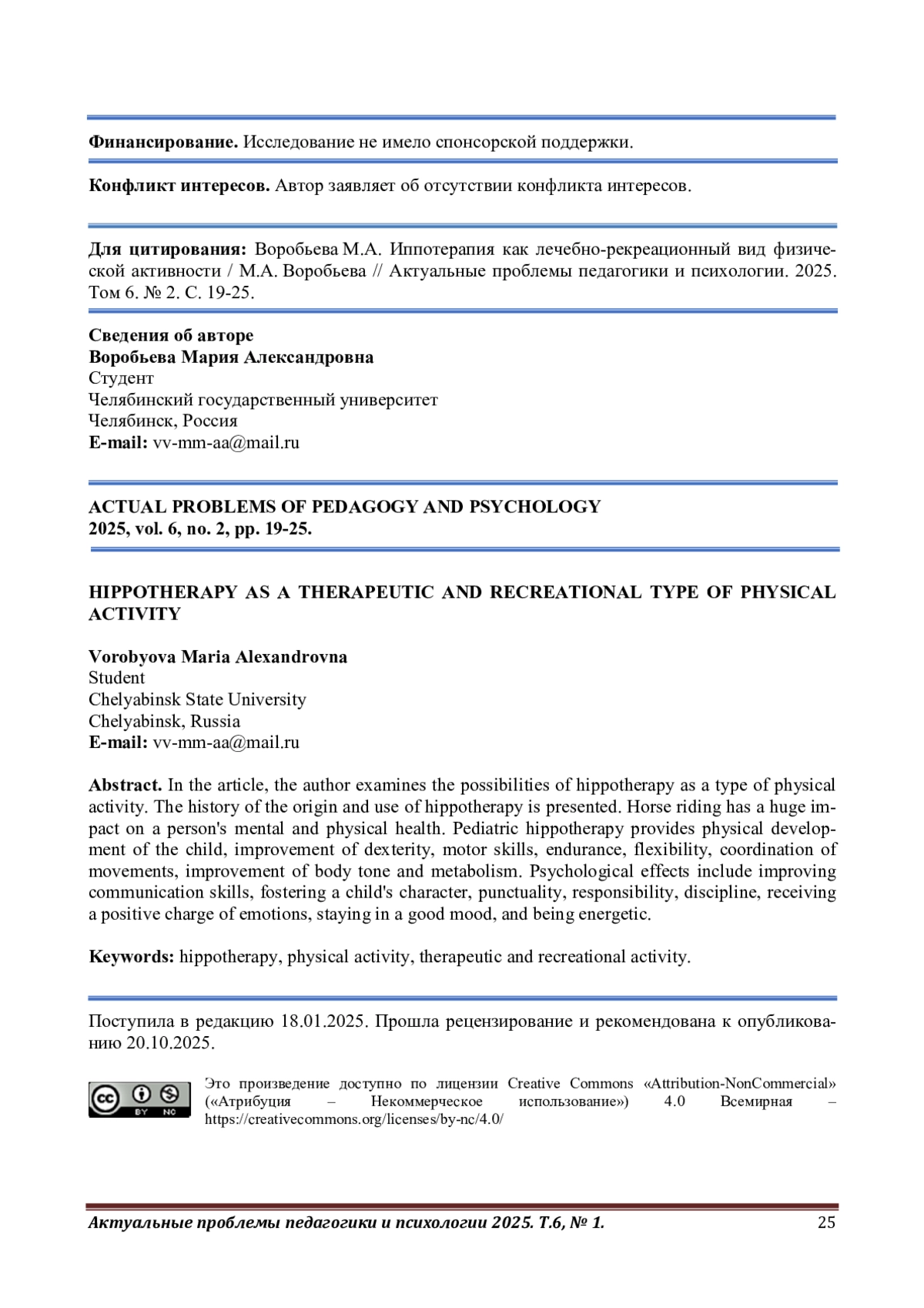 1. Антипова В.С., Шигабетдинова Г.М. Иппотерапия как вид адаптивной психологической физкультуры / Антипова В.С., Шигабетдинова Г.М. // Приоритетные направления развития науки и образования : сб. науч. тр. Чебоксары, 2015. С. 225-226.