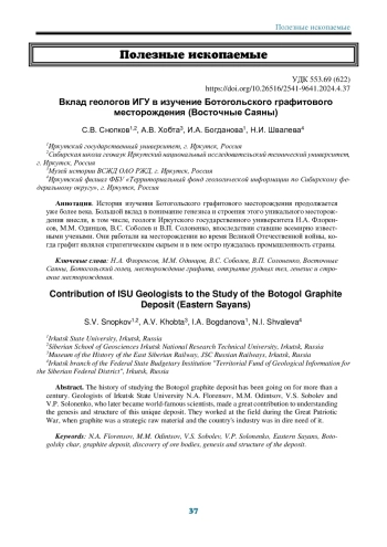 27. Snopkov S.V., Khobta A.V., Bogdanova I.A. The history of the geological study of the Botogol graphite deposit // Geology and the environment. 2023. Vol. 3, No. 3. P. 49-76.