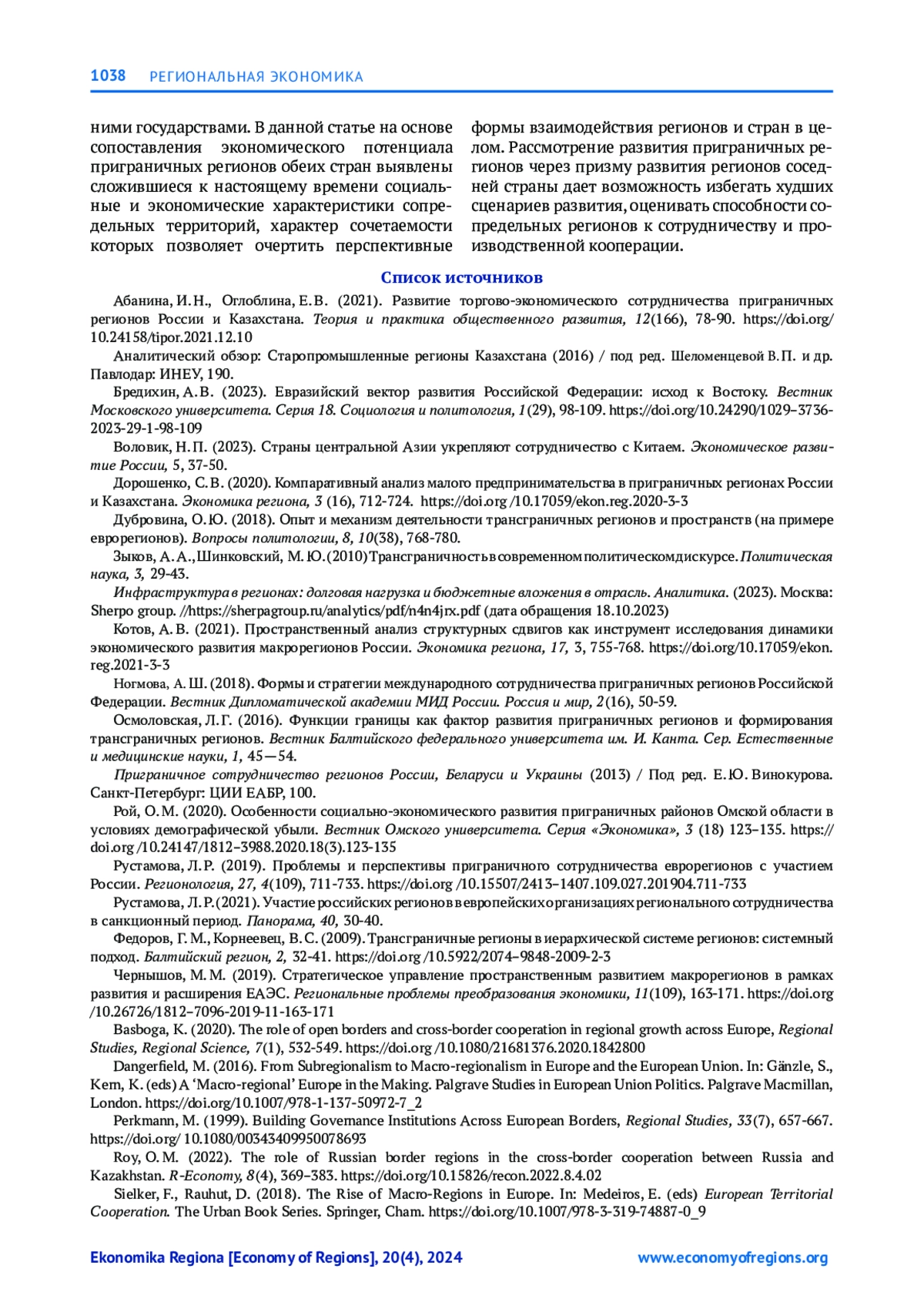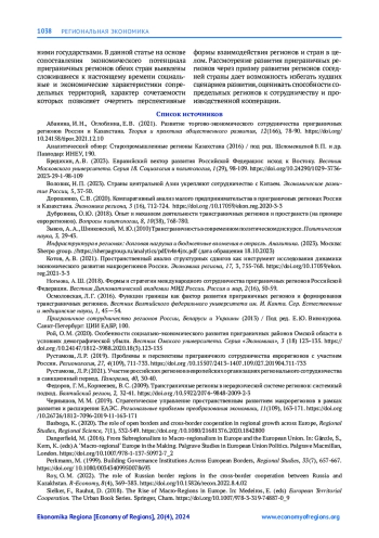 1. Абанина, И. Н., Оглоблина, Е. В. (2021). Развитие торгово-экономического сотрудничества приграничных регионов России и Казахстана. Теория и практика общественного развития, 12(166), 78-90. DOI: 10.24158/tipor.2021.12.10 EDN: WDCITR