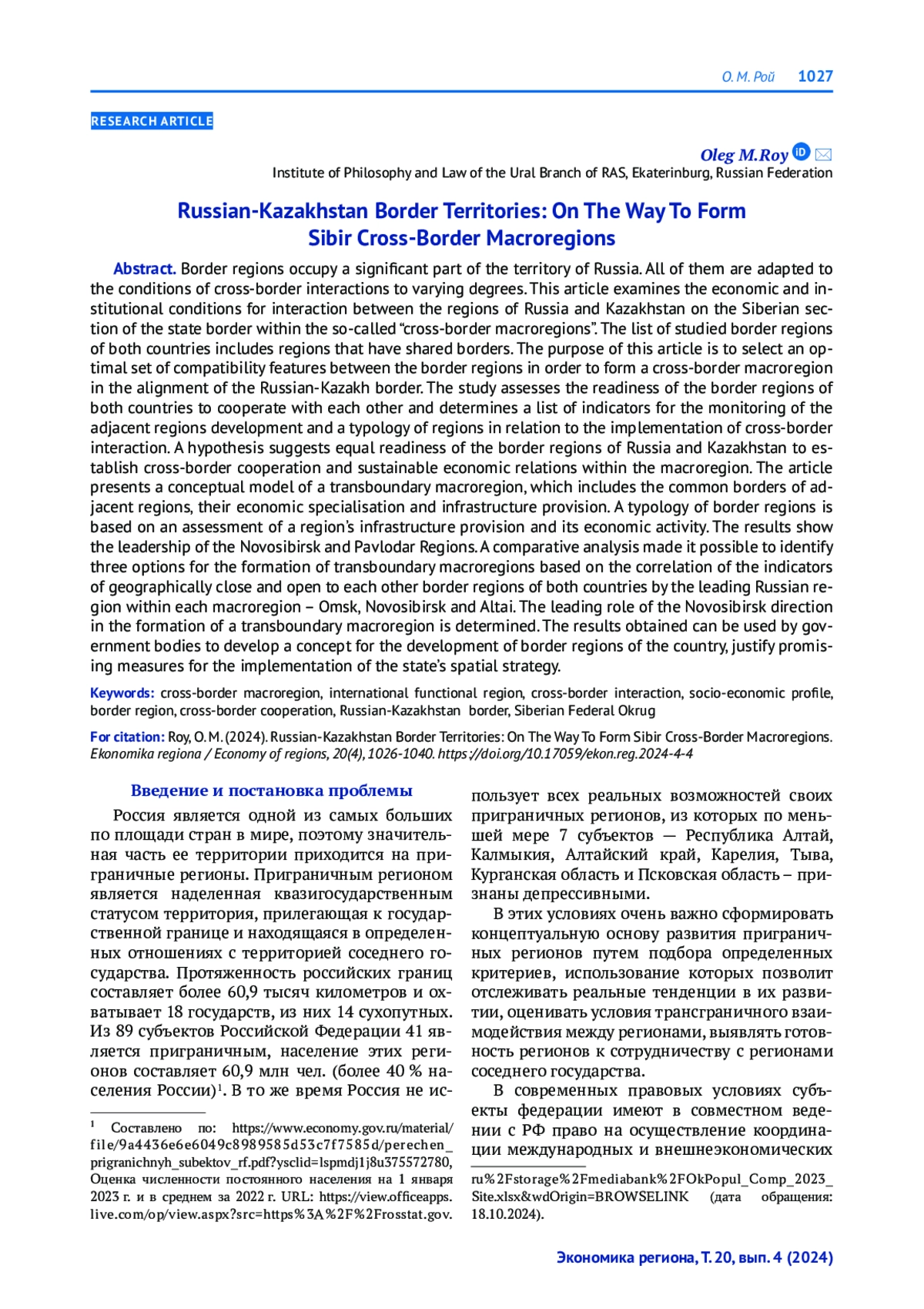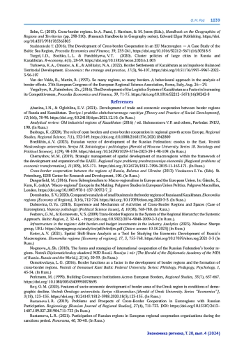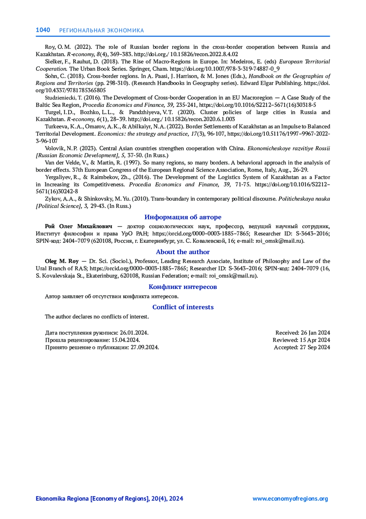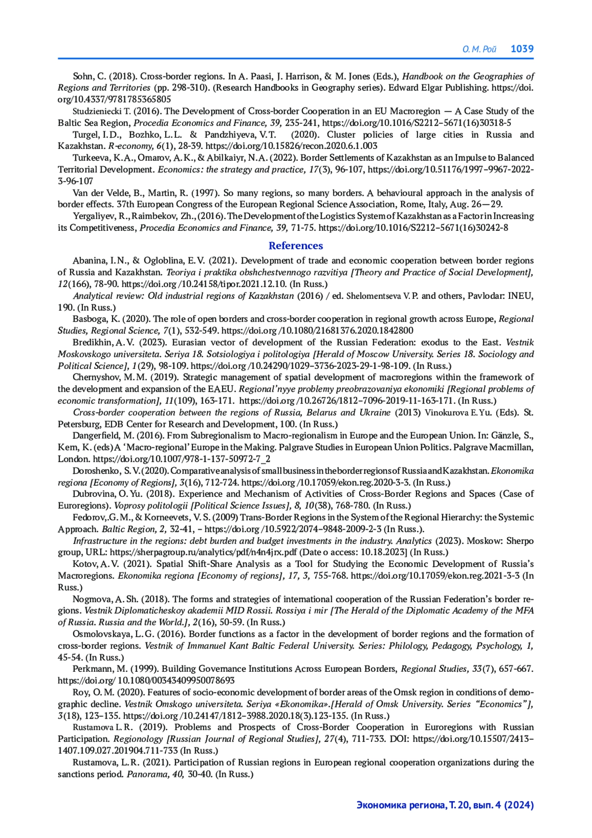 21. Roy, O. M. (2022). The role of Russian border regions in the cross-border cooperation between Russia and Kazakhstan. R-Economy, 8(4), 369-383. DOI: 10.15826/recon.2022.8.4.02 EDN: TICHHP