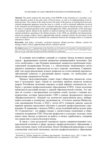 Анализируется государственная политика РСФСР по формированию системы среднего профессионального образования в первые годы советской власти, а также ее реализация в Иркутской губернии. Содержание исследования предполагает изучение процесса создания советского аппарата управления образованием в масштабах государства в целом, а также территориальных органов власти, занимавшихся вопросами формирования и развития системы профессионального образования в Иркутской губернии; анализ состояния профессионально-технического образования в регионе на протяжение 1920-х гг.; характеристику основных типов профессионально-технических учебных заведений. На основе анализа архивных материалов выделены и охарактеризованы основные типы профессиональных учебных заведений, работавших в Иркутской губернии в 1920-е гг.: школы для рабочих-подростков, школы фабрично-заводского ученичества, техникумы; рассмотрены положения о работе техникумов; показана связь формируемой системы профессионально-технического образования с имевшейся в досоветский период в Иркутской губернии материально-технической базой профессионально-технических курсов, школ, училищ, семинарий; выделены проблемы, требовавшие решения для улучшения деятельности учебных заведений. Сделан вывод о том, что процесс формирования системы среднего профессионального образования в Иркутской губернии проходил в русле общегосударственной политики в этой сфере.