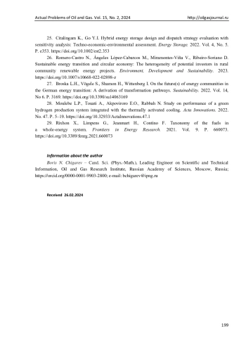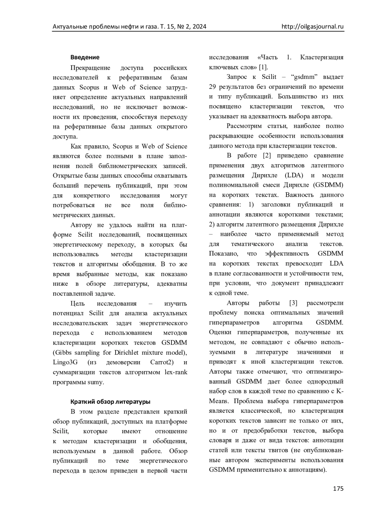 1. Чигарев Б.Н. Выявление актуальных задач энергетического перехода в публикациях агрегатора контента научных публикаций Scilit. Часть 1. Кластеризация ключевых слов // Актуальные проблемы нефти и газа. 2024. Т. 15, № 1. С. 72–94. https://doi.org/10.29222/ipng.2078-5712.2024-15-1.art6
