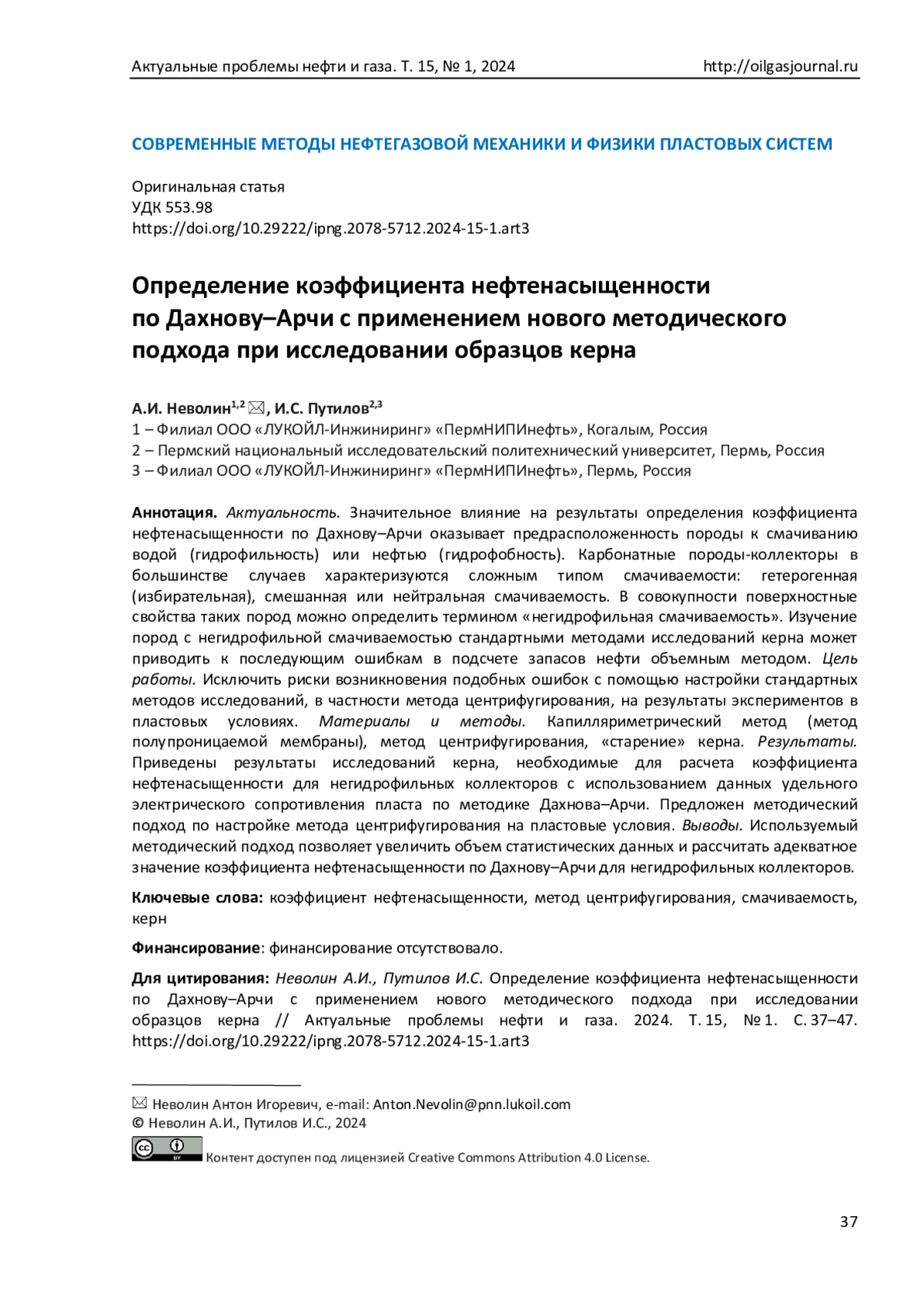 Актуальность. Значительное влияние на результаты определения коэффициента нефтенасыщенности по Дахнову–Арчи оказывает предрасположенность породы к смачиванию водой (гидрофильность) или нефтью (гидрофобность). Карбонатные породы-коллекторы в большинстве случаев характеризуются сложным типом смачиваемости: гетерогенная (избирательная), смешанная или нейтральная смачиваемость. В совокупности поверхностные свойства таких пород можно определить термином «негидрофильная смачиваемость». Изучение пород с негидрофильной смачиваемостью стандартными методами исследований керна может приводить к последующим ошибкам в подсчете запасов нефти объемным методом. Цель работы. Исключить риски возникновения подобных ошибок с помощью настройки стандартных методов исследований, в частности метода центрифугирования, на результаты экспериментов в пластовых условиях. Материалы и методы. Капилляриметрический метод (метод полупроницаемой мембраны), метод центрифугирования, «старение» керна. Результаты. Приведены результаты исследований керна, необходимые для расчета коэффициента нефтенасыщенности для негидрофильных коллекторов с использованием данных удельного электрического сопротивления пласта по методике Дахнова–Арчи. Предложен методический подход по настройке метода центрифугирования на пластовые условия. Выводы. Используемый методический подход позволяет увеличить объем статистических данных и рассчитать адекватное значение коэффициента нефтенасыщенности по Дахнову–Арчи для негидрофильных коллекторов.