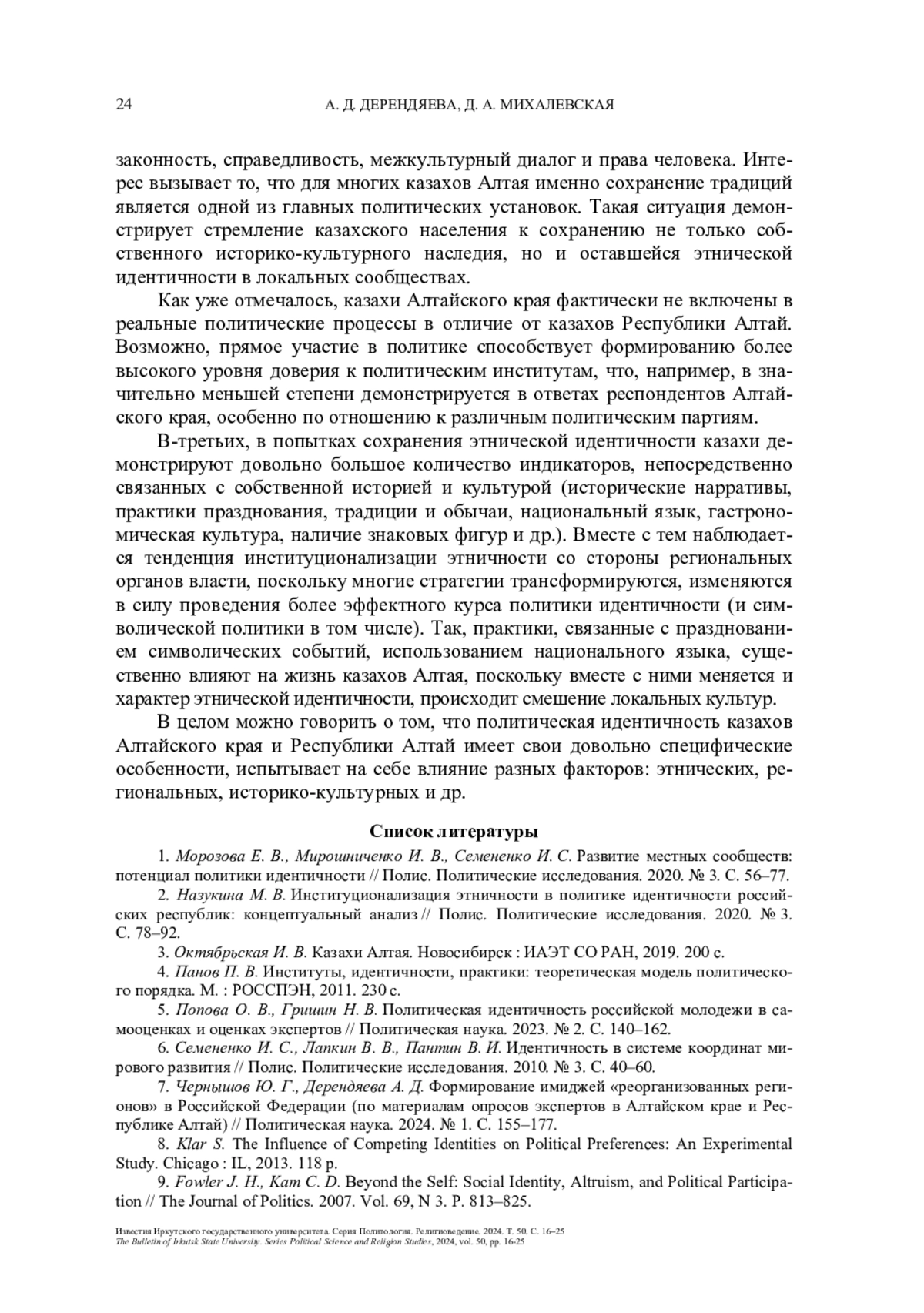 7. Чернышов Ю. Г., Дерендяева А. Д. Формирование имиджа «реорганизованных регионов» в Российской Федерации (по материалам опросов экспертов в Алтайском крае и Республики Алтай) // Политическая наука. 2024. № 1. С. 155-177. EDN: EQTPQF