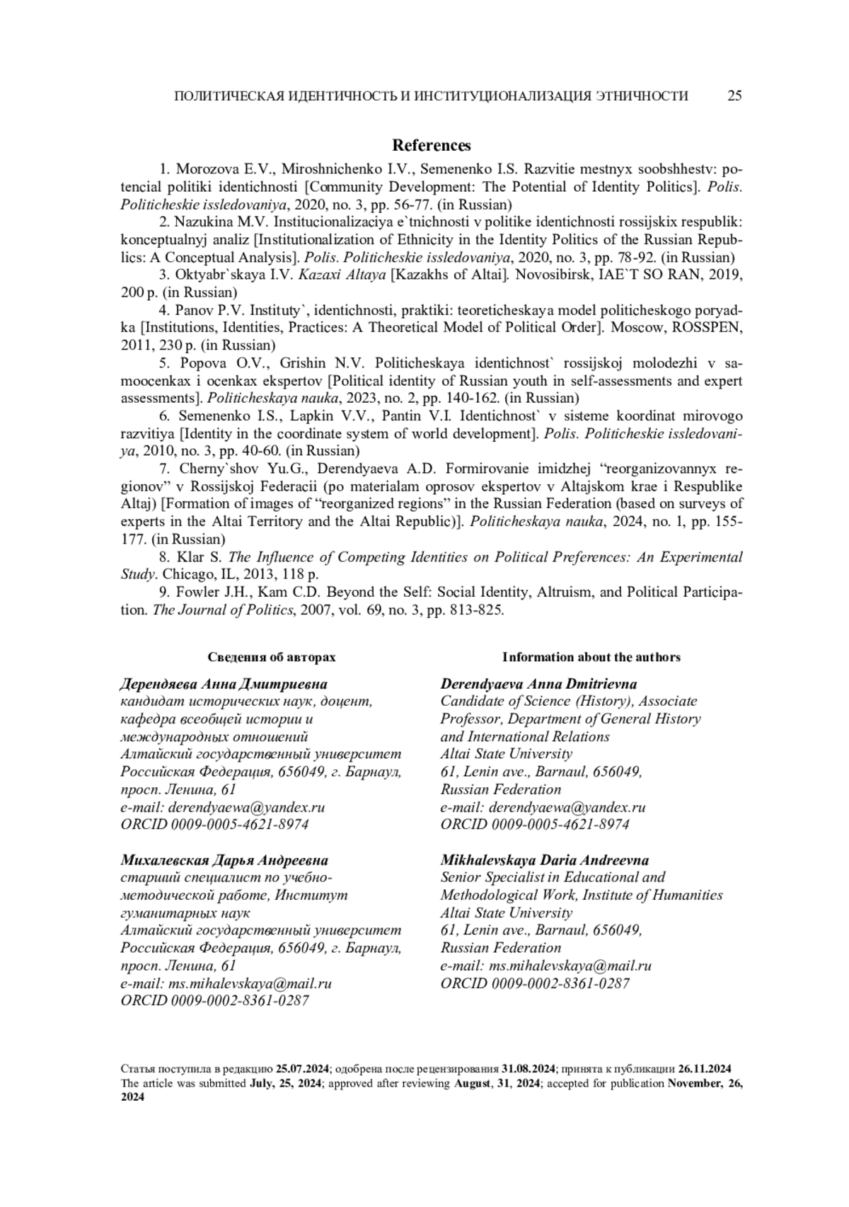 2. Назукина М. В. Институционализация этничности в политике идентичности российской республики: концептуальный анализ // Полис. Политические исследования. 2020. № 3. С. 78-92. EDN: FXIPLH