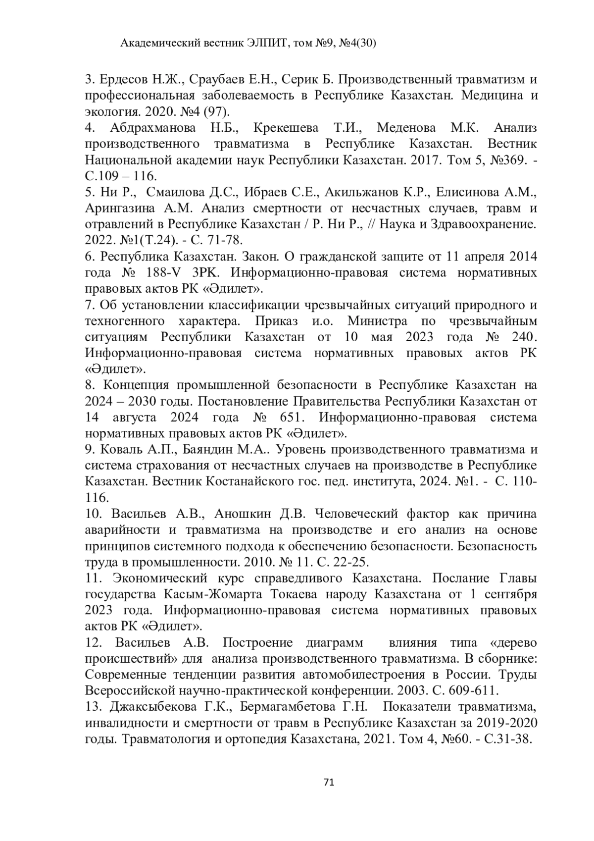 9. Коваль А.П., Баяндин М.А.. Уровень производственного травматизма и система страхования от несчастных случаев на производстве в Республике Казахстан. Вестник Костанайского гос. пед. института, 2024. №1. - С. 110-116.