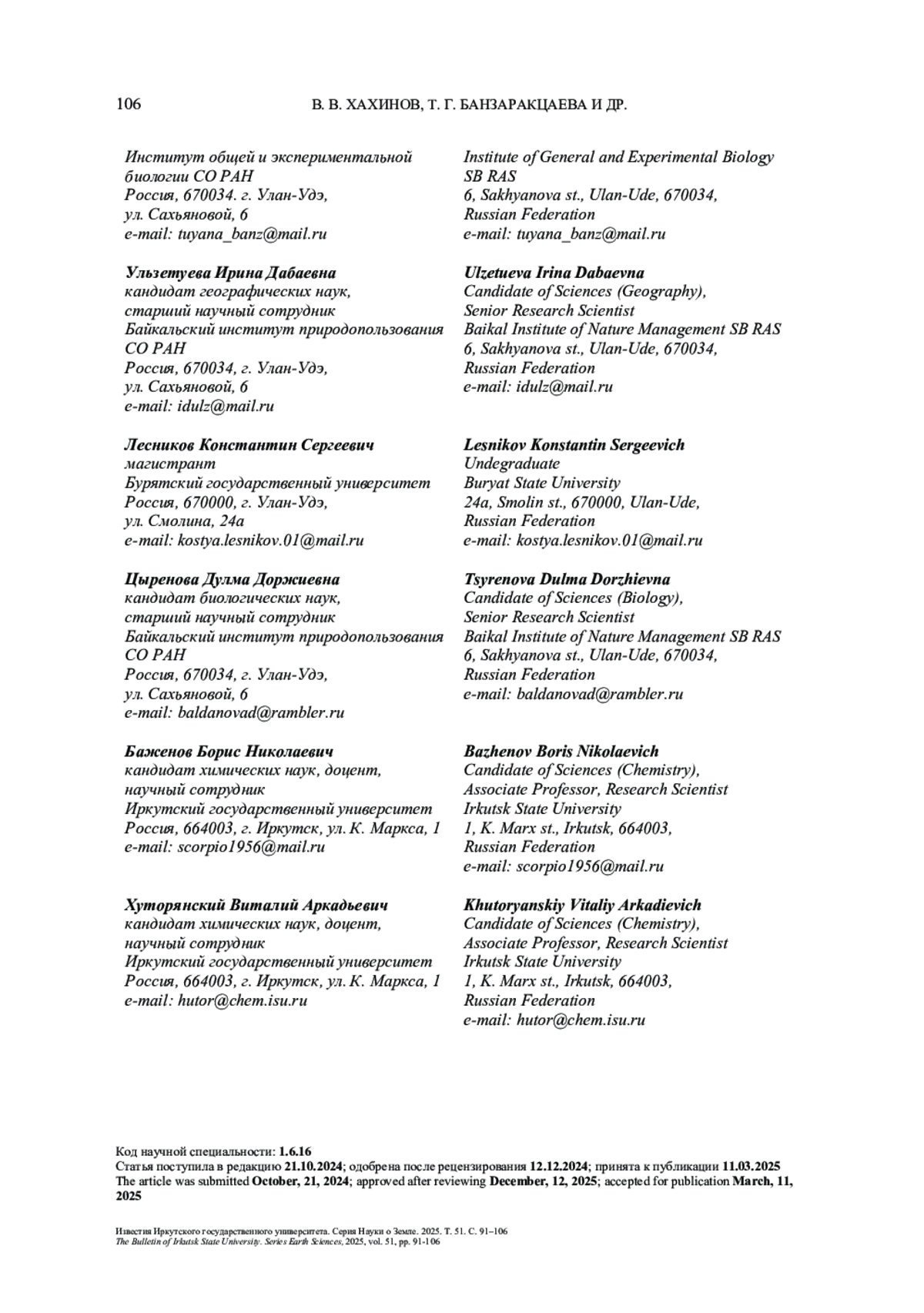 ХАХИНОВ В. В., БАНЗАРАКЦАЕВА Т. Г., УЛЬЗЕТУЕВА И. Д., ЛЕСНИКОВ К. С., ЦЫРЕНОВА Д. Д., БАЖЕНОВ Б. Н., ХУТОРЯНСКИЙ В. А. ГЕОХИМИЧЕСКОЕ ИССЛЕДОВАНИЕ СЕРОВОДОРОДНОГО ИСТОЧНИКА БЕЗЫМЯННОГО (ПРИБАЙКАЛЬСКИЙ РАЙОН, РЕСПУБЛИКА БУРЯТИЯ) // ИЗВЕСТИЯ ИРКУТСКОГО ГОСУДАРСТВЕННОГО УНИВЕРСИТЕТА. СЕРИЯ: НАУКИ О ЗЕМЛЕ. 2025. ТОМ 51
