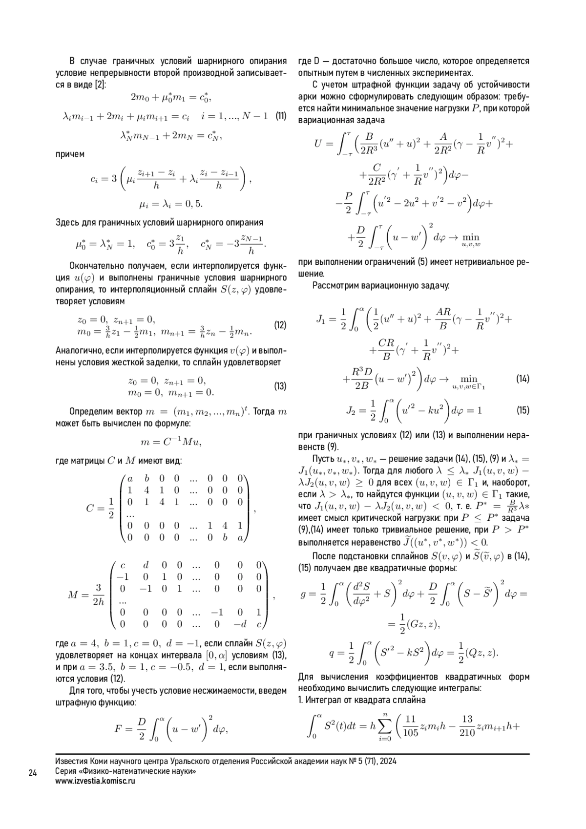 Расчет на устойчивость сложных тонкостенных конструкций связан с исследованием вариационных неравенств или решением вариационных задач с ограничениями на искомые функции в форме неравенств. Проблема устойчивости круговых арок раннее рассматривалась Е. Л. Николаи [1].