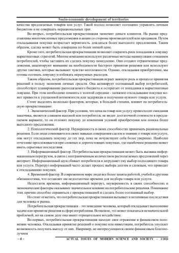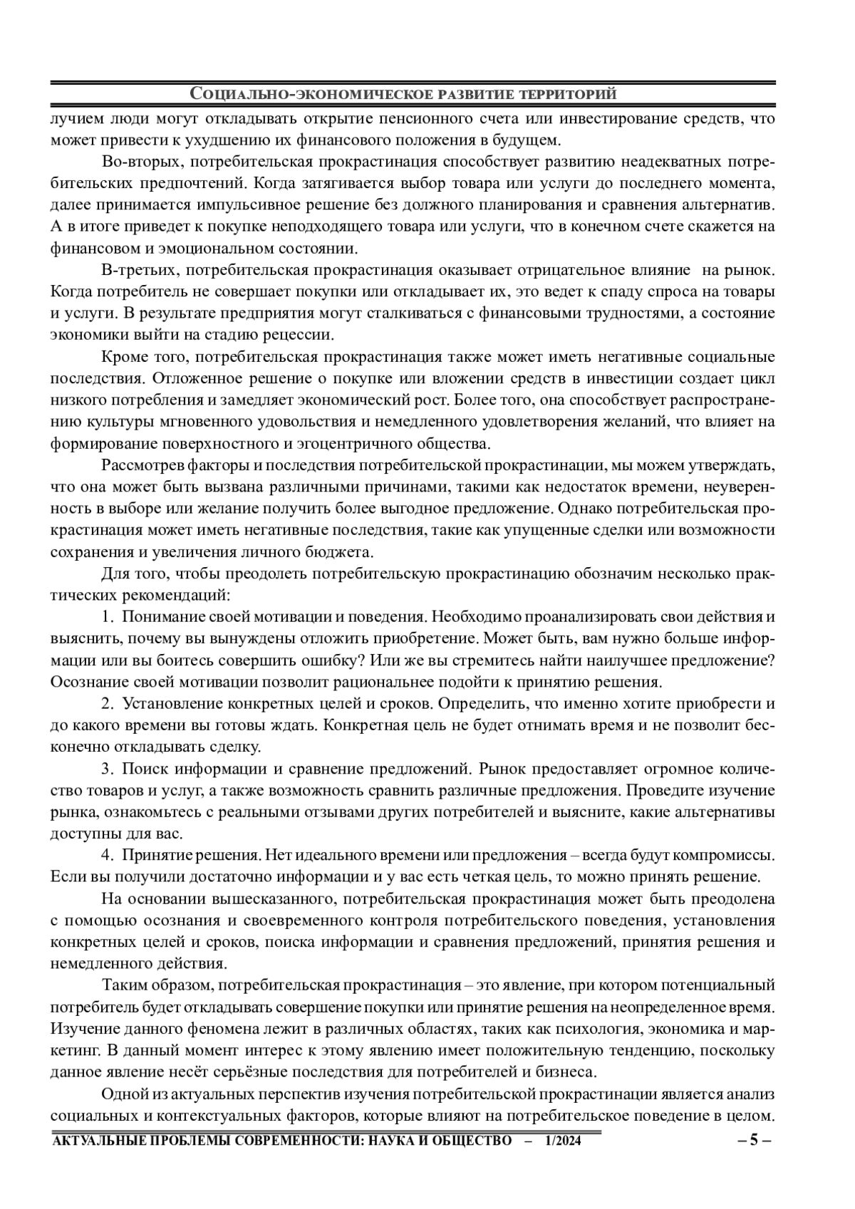 В статье рассматривается понятие «потребительская прокрастинация», определяется важность изучения данного феномена, обозначаются ключевые факторы и последствия потребительской прокрастинации для человека и экономики, а также предлагаются практические рекомендации по преодолению потребительской прокрастинации.