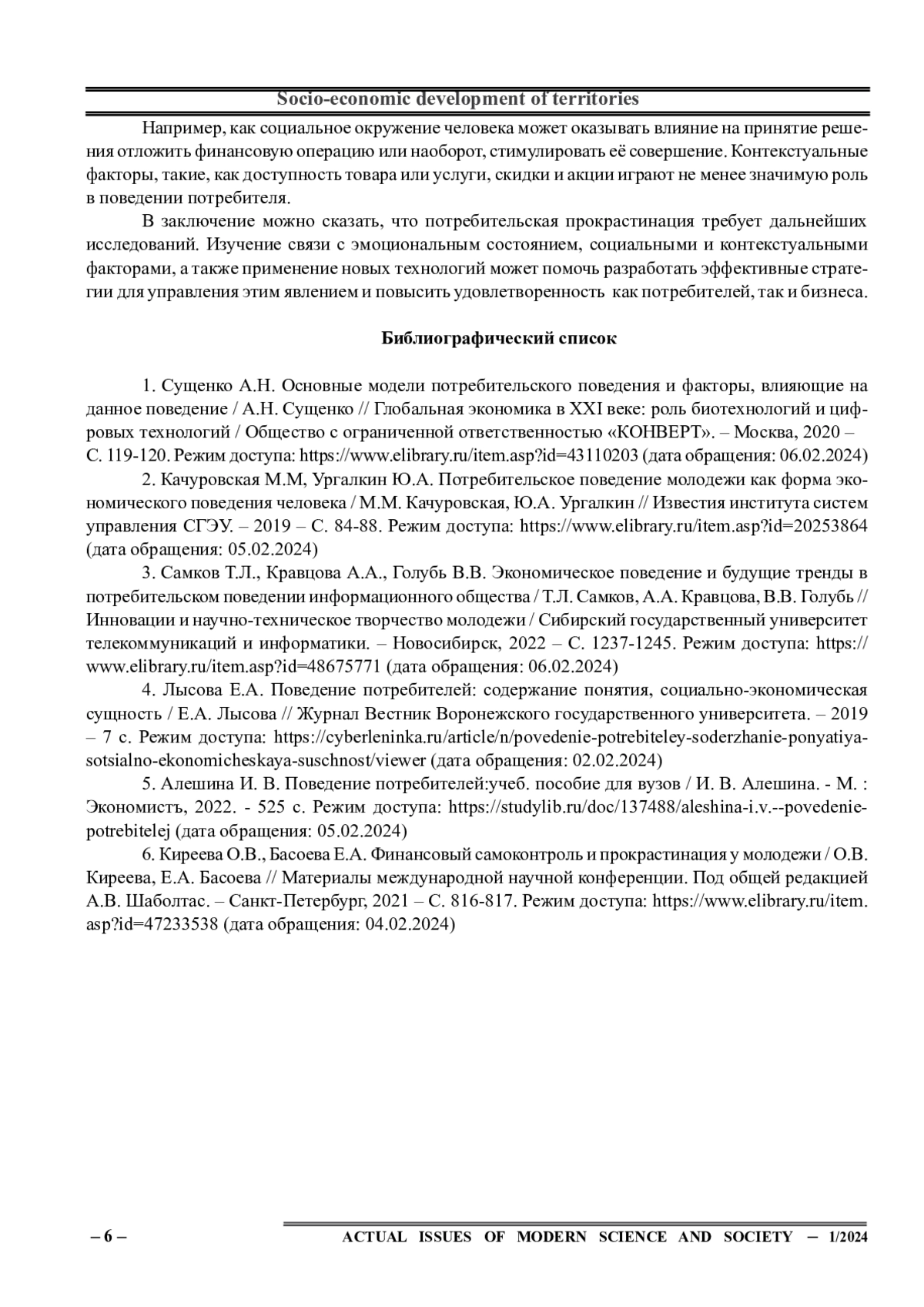 1. Сущенко А.Н. Основные модели потребительского поведения и факторы, влияющие на данное поведение / А.Н. Сущенко // Глобальная экономика в XXI веке: роль биотехнологий и цифровых технологий / Общество с ограниченной ответственностью «КОНВЕРТ». – Москва, 2020 – С. 119-120. Режим доступа: https://www.elibrary.ru/item.asp?id=43110203 (дата обращения: 06.02.2024)