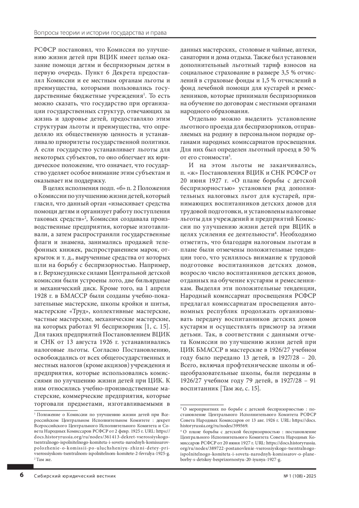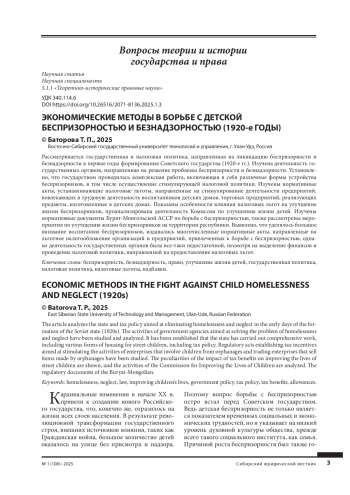 Рассматривается государственная и налоговая политика, направленная на ликвидацию беспризорности и безнадзорности в первые годы формирования Советского государства (1920-е гг.). Изучена деятельность государственных органов, направленная на решение проблемы беспризорности и безнадзорности. Установлено, что государством проводилась комплексная работа, включающая в себя различные формы устройства беспризорников, в том числе осуществление стимулирующей налоговой политики. Изучены нормативные акты, устанавливающие налоговые льготы, направленные на стимулирование деятельности предприятий, вовлекающих в трудовую деятельность воспитанников детских домов, торговых предприятий, реализующих предметы, изготовленные в детских домах. Показаны особенности влияния налоговых льгот на улучшение жизни беспризорников, проанализирована деятельность Комиссии по улучшению жизни детей. Изучены нормативные документы Бурят-Монгольской АССР по борьбе с беспризорностью, также рассмотрены мероприятия по улучшению жизни беспризорников на территории республики. Выявлено, что уделялось большое внимание воспитанию беспризорников, издавались многочисленные нормативные акты, направленные на льготное налогообложение организаций и предприятий, привлеченных к борьбе с беспризорностью, однако деятельность государственных органов была все-таки недостаточной, несмотря на выделение финансов и проведение налоговой политики, направленной на предоставление налоговых льгот.