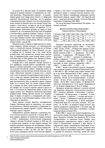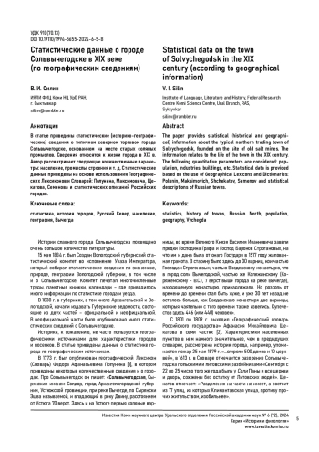 В статье приведены статистические (историко-географические) сведения о типичном северном торговом городе Сольвычегодске, основанном на месте старых соляных промыслов. Сведения относятся к жизни города в XIX в. Автор рассматривает следующие количественные параметры: население, промыслы, строения и т. д. Статистические данные приведены на основе использования Географических Лексиконов и Словарей: Полунина, Максимовича, Щекатова, Семенова и статистических описаний Российских городов.