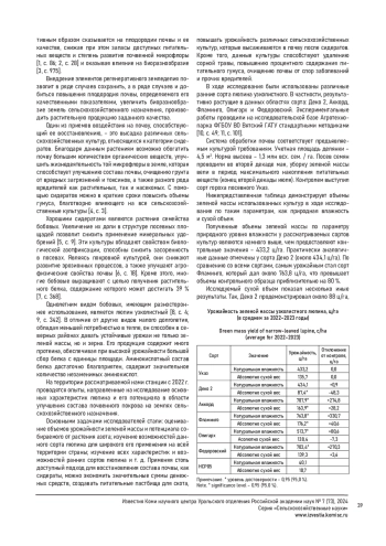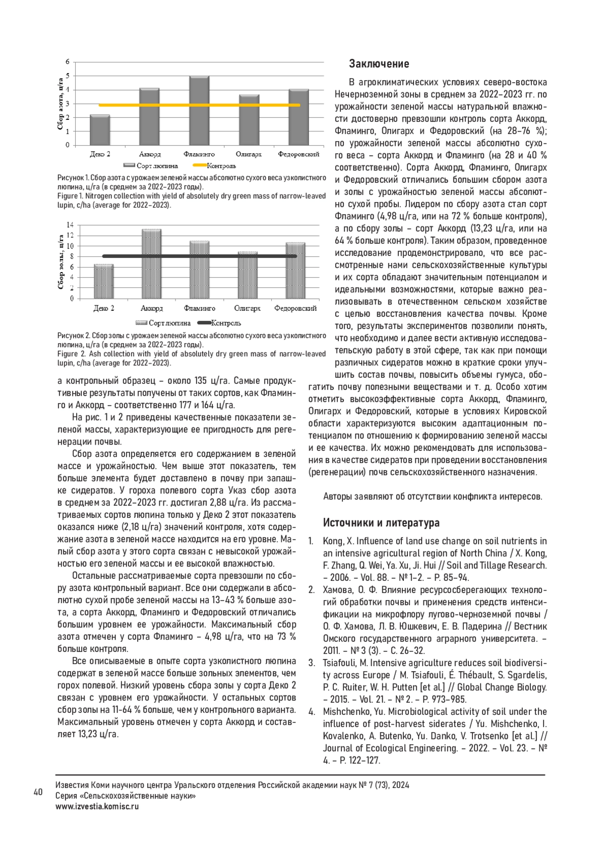 Забота об экологической безопасности страны требует внедрения современных безвредных для окружающей среды способов хозяйствования. Для сохранения и восстановления почвенного плодородия большое значение имеет обогащение ее дополнительным количеством органического вещества. В сельском хозяйстве распространено удобрение почвы не только продуктами жизнедеятельности выращиваемого скота, но и растительной органикой. В частности, одним из эффективных вариантов является высадка сидератов, способных обогащать почвы огромным количеством полезных и питательных веществ. Конечно, прежде чем высаживать подобные культуры, следует учитывать, что не все из них могут обогащать состав почвы. Если говорить об условиях в Кировской области, в частности, об особенностях климата в период с 2022 по 2023 г., то здесь довольно неплохо росло такое растение, как люпин узколистный. Высадка данной культуры позволила получить неплохие результаты: объем зеленой массы растения составил более чем 625,6 ц/га. Подобное количество травы намного превосходит самые известные сорта других сельскохозяйственных культур, к примеру, полевого гороха сортов Аккорд, Фламинго, Олигарх и Федоровский (на 28-76 %); по урожайности зеленой массы абсолютно сухого веса - сорта Аккорд и Фламинго (на 28 и 40 % соответственно). Лидером по сбору азота стал сорт Фламинго (4,98 ц/га, или 72 % больше контроля), а по сбору золы - сорт Аккорд (13,23 ц/га, или 64 % больше контроля). Сорта узколистного люпина Аккорд, Фламинго, Олигарх и Федоровский можно рекомендовать для использования в качестве сидератов при проведении восстановления (регенерации) почв сельскохозяйственного назначения.