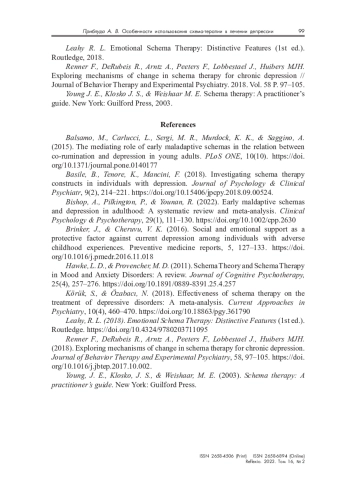 3. Bishop A., Pilkington P., & Younan R. Early maldaptive schemas and depression in adulthood: A systematic review and meta-analysis // Clinical Psychology & Psychotherapy, 2022. Vol. 29. № 1. P. 111-130.