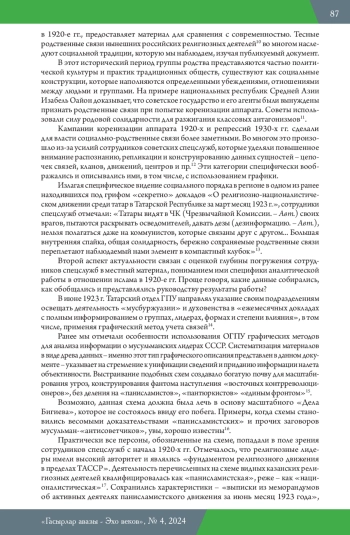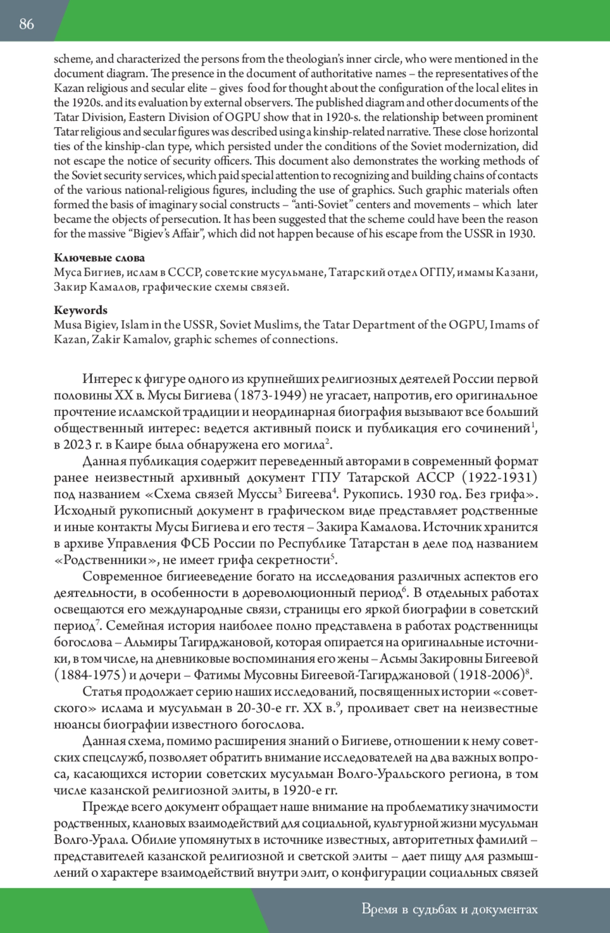 Публикуемая схема воспроизводит содержание ранее неизвестного документа Татарского отдела ОГПУ под названием «Схема связей Мусы Бигеева. 1930 год», который в графическом виде представлял родственные и дружественные контакты известного татарского богослова и общественно-политического Мусы Бигиева (1873-1949) и его тестя - Закира Камалова (1804-1893). Для удобства чтения и работы с документом авторы перевели рукописную схему в современный формат, был проведен общий анализ содержания схемы, охарактеризованы упомянутые в документе персоны из ближнего круга богослова. Наличие в документе авторитетных фамилий - представителей казанской религиозной и светской элиты - дает пищу для размышлений о конфигурации местных элит в 1920-е гг. и ее оценке внешними наблюдателями. Публикуемая схема и иные документы Татарского отдела, Восточного отдела ОГПУ показывают, что в 1920-е гг. взаимоотношения между видными татарскими религиозными и светскими деятелями описывались с использованием родственно-кланового нарратива. От сотрудников спецслужб не ускользали эти тесные горизонтальные связи родственно-кланового типа, сохранявшиеся в условиях советской модернизации. Документ также демонстрирует методы работы сотрудников советских спецслужб, которые уделяли повышенное внимание распознанию и выстраиванию цепочек контактов тех или иных национально-религиозных деятелей, в том числе, с использованием графики. Подобные графические материалы часто ложись в основу воображаемых социальных конструктов - «антисоветских» центров, движений - которые впоследствии становились объектами преследований. Высказывается предположение, что схема могла стать обоснованием масштабного «Дела Бигиева».