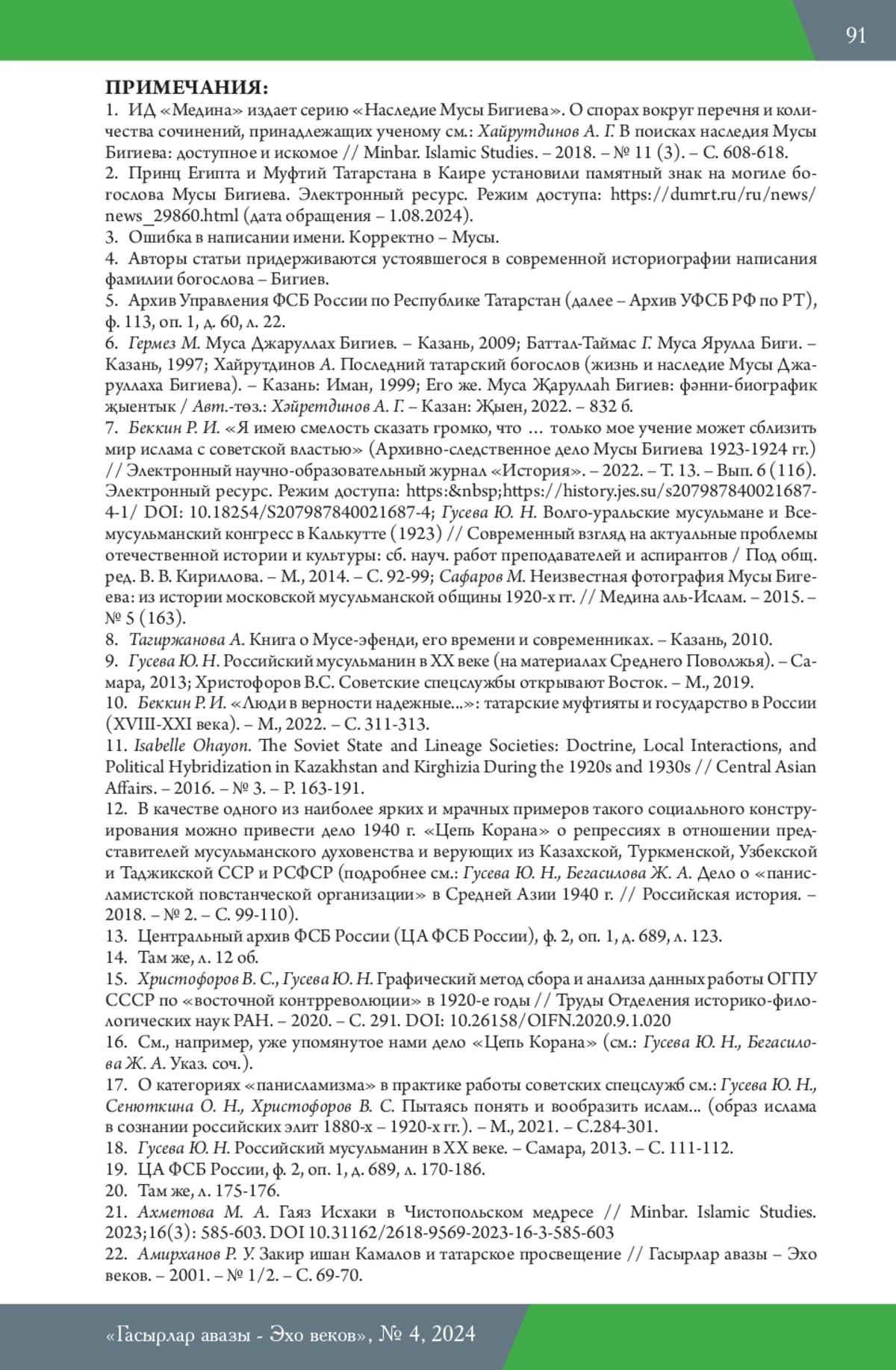 3. Беккин Р. И. “Я имею смелость сказать громко, что … только мое учение может сблизить мир ислама с советской властью” (Архивно-следственное дело Мусы Бигиева 1923-1924 гг.) // Электронный научно-образовательный журнал “История”. - 2022. - T. 13. - Вып. 6 (116). URL: https://history.jes.su/s207987840021687-4-1/. DOI: 10.18254/S207987840021687-4 EDN: BKFBPC