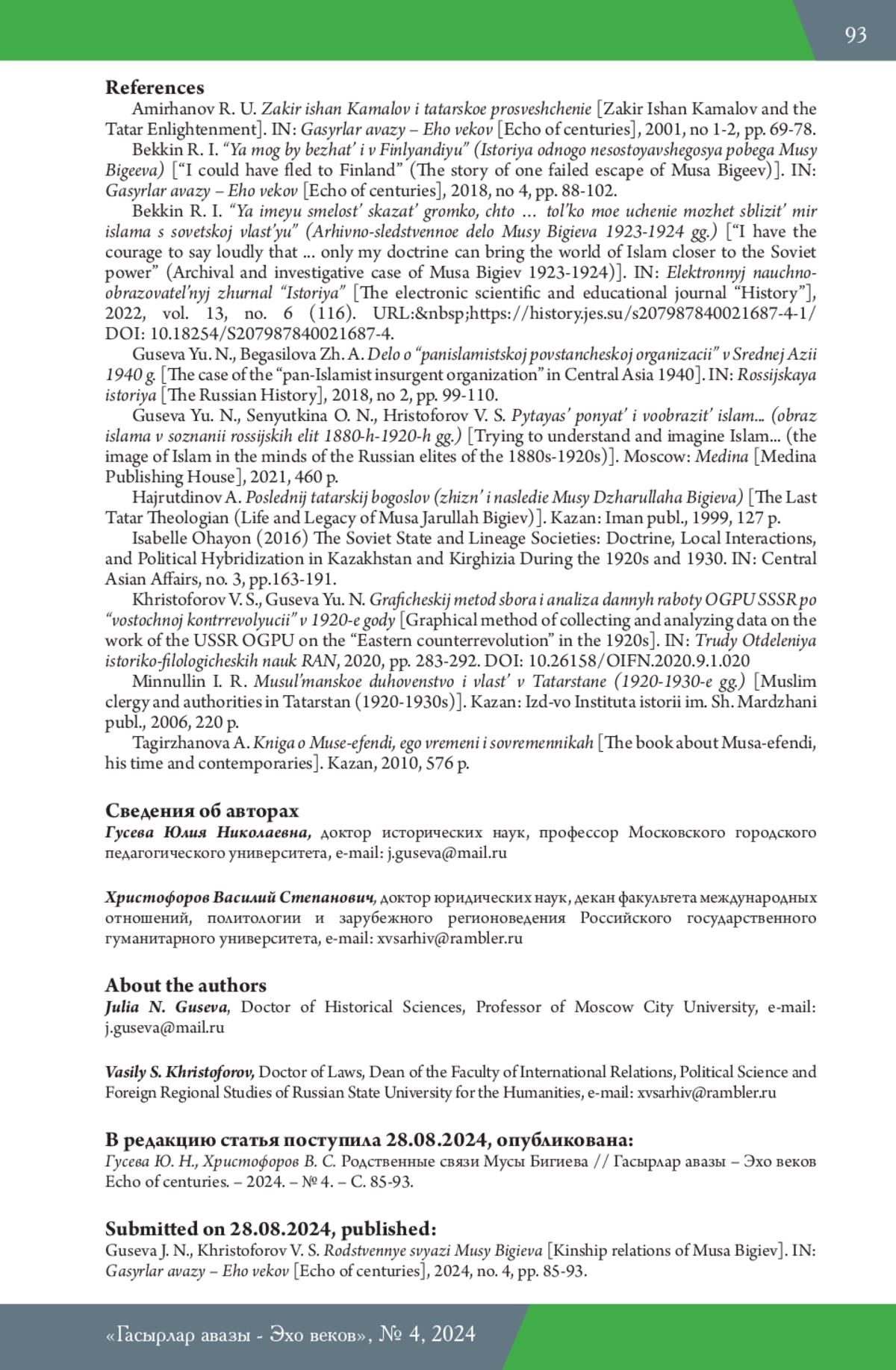 Guseva Yu. N., Begasilova Zh. A. Delo o “panislamistskoj povstancheskoj organizacii” v Srednej Azii 1940 g. [The case of the “pan-Islamist insurgent organization” in Central Asia 1940]. IN: Rossijskaya istoriya [The Russian History], 2018, no 2, pp. 99-110.