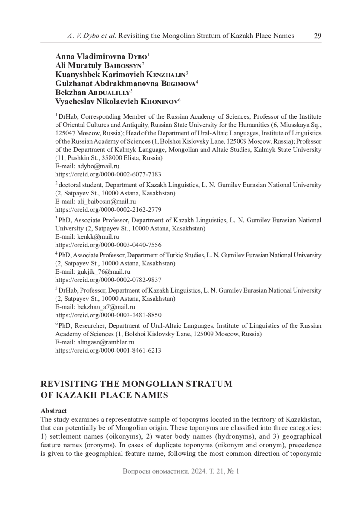 The study examines a representative sample of toponyms located in the territory of Kazakhstan, that can potentially be of Mongolian origin. These toponyms are classified into three categories: 1) settlement names (oikonyms), 2) water body names (hydronyms), and 3) geographical feature names (oronyms). In cases of duplicate toponyms (oikonym and oronym), precedence is given to the geographical feature name, following the most common direction of toponymic transfer. The analysis investigates the significance of Mongolian names in the Kazakh language, encompassing motivational, word-formational, and etymological aspects, and proposes new hypotheses of their origin while considering earlier theories. The authors identify the main challenges faced by etymologists and toponymists and review previous authors’ unsuccessful etymological solutions. Errors detected in the data include references to Russified place names borrowed into contemporary Kazakh, inattention to early toponym records, neglect of phonetic changes in Kazakh and Mongolian, as well as their relative chronology, and disregard of potential phonetic adaptation patterns that one could expect based on the phonological peculiarities of both the source and receiving languages. The study aims to categorise place names according to the time and source of borrowing, each name being evaluated based on whether it was initially borrowed as a toponym or an appellative word that later integrated a Kazakh toponym. The analysis concludes that Kazakh toponymy of Mongolian origin (i. e. place names that were borrowed as toponyms) is predominantly recent and associated with the borders of two historical Mongolian states - the Dzungar and Kalmyk khanates.