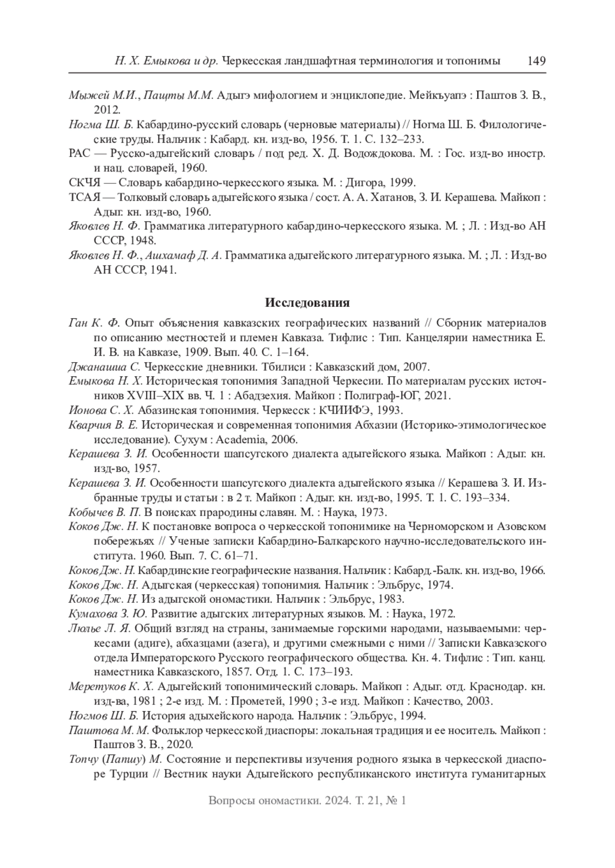 17. Емыкова Н. Х. Историческая топонимия Западной Черкесии. По материалам русских источников XVIII-XIX вв. Ч. 1: Абадзехия. Майкоп: Полиграф-ЮГ, 2021.