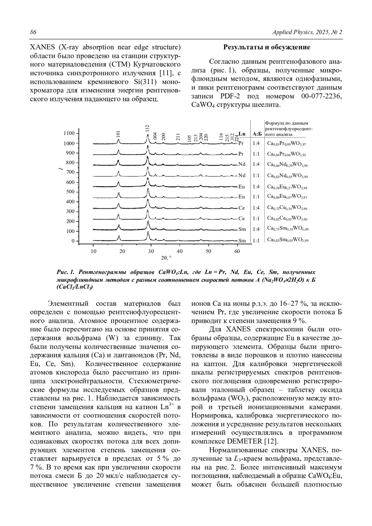 Исследовано влияние легирования редкоземельными элементами, в частности трёх-зарядными лантаноидами Ln3+ (Ln = Pr, Nd, Eu, Ce, Sm), на люминесцентные свойства вольфрамата кальция со структурой шеелита, полученного микрофлюидным методом. Согласно данным рентген-индуцированной оптической люминесценции (XEOL) можно утверждать, что легирование европием приводит к наиболее интенсивной люминесценции шеелита. Проведен количественный элементный анализ состава получаемых микрофлюидным способом образцов шеелита методом рентгеновского флуоресцентного анализа и также качественный анализ спектров рентгеновского поглощения (XANES) вблизи L3-края поглощения W для Eu-замещенного вольфрамата, как образца, обеспечивающего наибольший выход флуоресценции