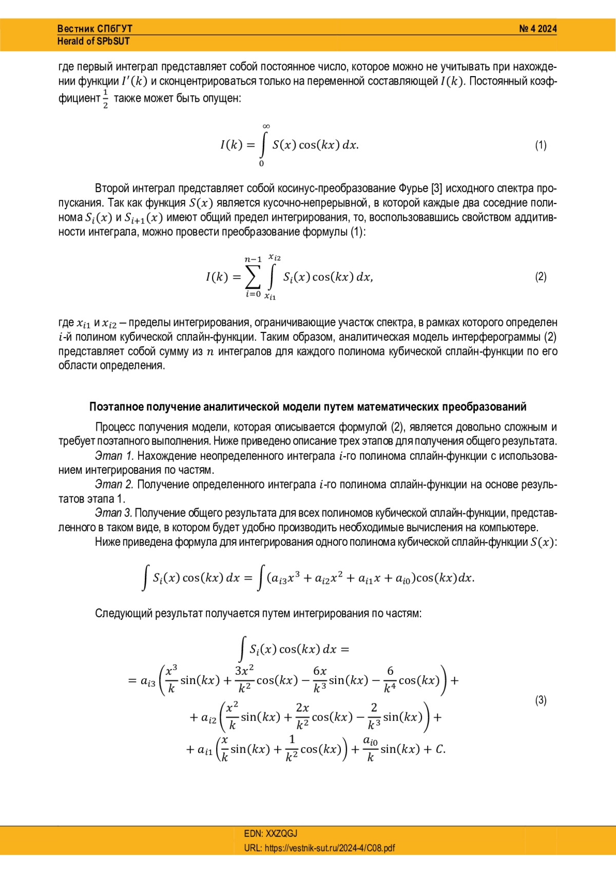 Результат: по итогам работы получено аналитическое выражение восстановленной интерферограммы в общем виде с переменными коэффициентами, уникальными для каждой пластины. Аналитическое выражение представляет собой сумму тригонометрических функций с аргументами, равными пределам интегрирования полиномов сплайн-функции. Однако на практике каждая тригонометрическая функция делится на независимую переменную, возведенную в целую степень от 1 до 4. Это позволяет сделать вывод, что любая интерферограмма, полученная в соответствии с данной моделью, имеет локальные максимумы, чьи значения постепенно уменьшаются по мере увеличения независимой переменной. Разработано программное обеспечение, позволяющее проводить вычисления коэффициентов, благодаря чему возможно получение как аналитического, так и дискретного представления интерферограммы для множества исходных спектров пропускания. Приведены примеры результатов работы программного обеспечения, которые представлены в виде графика интерферограммы, аналитического выражения в текстовом файле, а также в виде таблицы с рассчитанными коэффициентами. Теоретическая / Практическая значимость: применение аналитического представления вместо графического позволит на количественном уровне представить различия между разными интерферограммами, на первый взгляд схожими визуально. В перспективе это поможет сопоставлять пластины нужного качества с определенными физическими показателями.