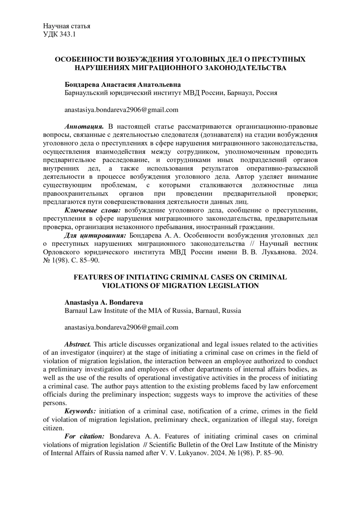 7. Кузнецов В. А. Особенности возбуждения уголовного дела по преступлениям, связанным с организацией незаконной миграции // Вестник экономической безопасности. 2016. № 1. С. 124-130. EDN: VQTZLR