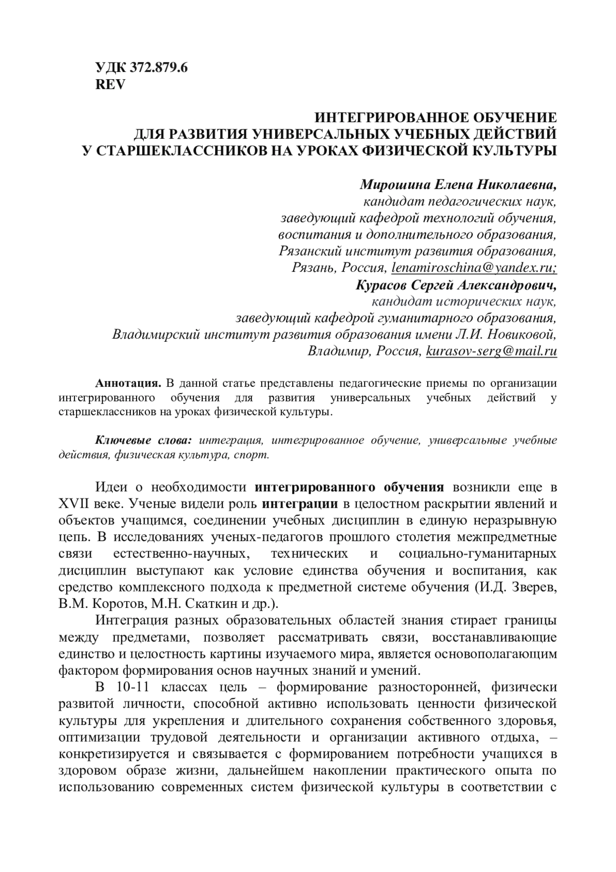 В данной статье представлены педагогические приемы по организации интегрированного обучения для развития универсальных учебных действий у старшеклассников на уроках физической культуры.