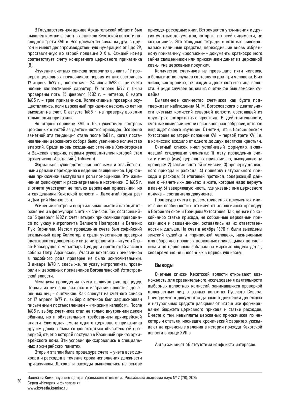 В статье рассмотрен комплекс счетных списков церковных приказчиков Кехотской волости последней трети XVII в. Значение счетных списков заключается в том, что они раскрывают один из механизмов, позволявших волости контролировать деятельность выборных должностных лиц. В работе дана общая характеристика сохранившегося комплекса документов, выявлены особенности формуляра счетных списков, участие в проверке представителей церковной власти Двинского уезда.
