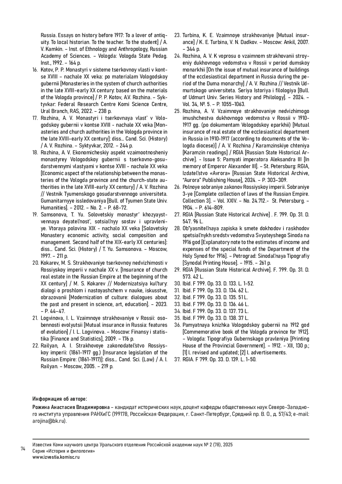 25. Рожина, А. В. Взаимное страхование недвижимого имущества духовного ведомства в России в 1910-1917 гг. (по документам Вологодской епархии) / А. В. Рожина // Карамзинские чтения / РГИА. - Вып. 5: Памяти императора Александра III. - СПб.: РГИА, Издательство «Аврора», 2024. - С. 303-309.