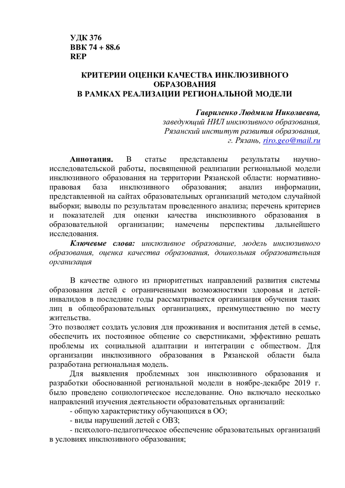 В статье представлены результаты научно-исследовательской работы, посвященной реализации региональной модели инклюзивного образования на территории Рязанской области: нормативно-правовая база инклюзивного образования; анализ информации, представленной на сайтах образовательных организаций методом случайной выборки; выводы по результатам проведенного анализа; перечень критериев и показателей для оценки качества инклюзивного образования в образовательной организации; намечены перспективы дальнейшего исследования.